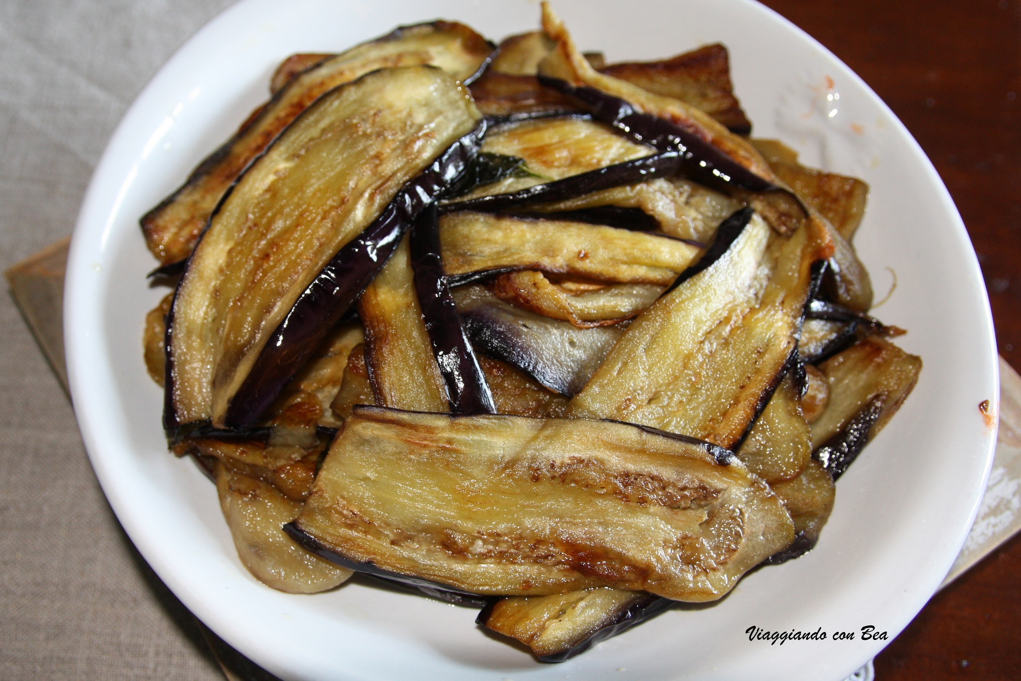 Affettate le melanzane togliendo parte della buccia esterna, mettetele in una pirofila per un’oretta con un pugno di sale grosso e con dell’acqua al fine di togliere l’amaro