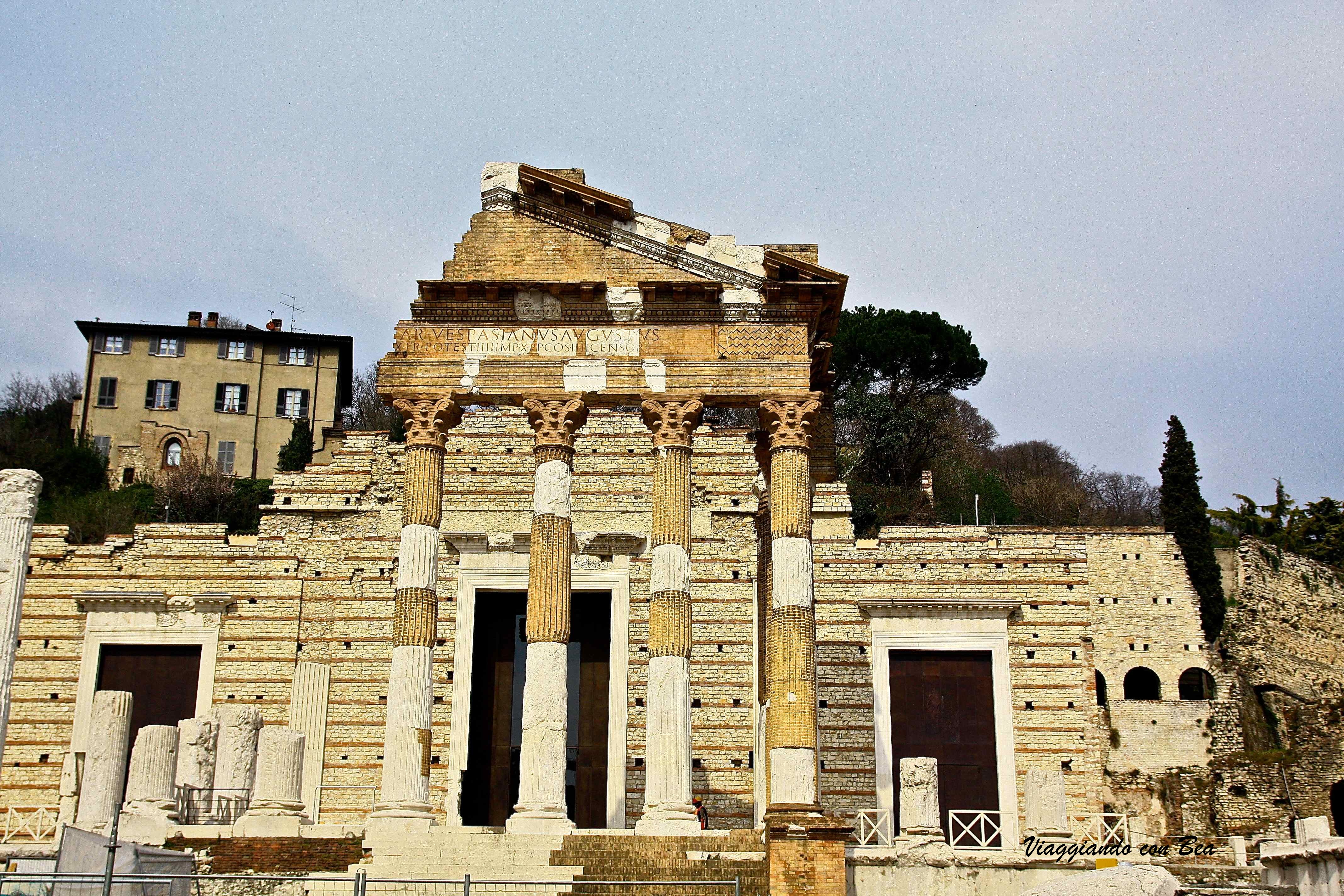 Da torre in torre, un po’ chiacchierando, un po’ fotografando, siamo ritornate verso le viuzze del centro storico dove ci siamo concesse una meritata pausa in una delle più antiche osterie di Brescia, Osteria la Grotta. Con le sue volte in pietra conserva un fascino particolare ed inoltre abbiamo pranzato divinamente. Se passate da Brescia non mancate di concedervi anche Voi questa piccola coccola per gustare dei magnifici casoncelli ed il “Manzo all’Olio”, una delle specialità di questa caratteristica osteria. Terminato il pranzo, le ore che avevamo a disposizione per completare il giro turistico erano veramente poche e così con passo deciso, ignorando i bei negozi che si affacciano sulle vie del centro, ci siamo dirette verso l’ultima tappa del nostro programma: Via dei Musei. Questa via, lunga quasi 1 km, catapulta il visitatore nel cuore dell’antica Brixia. Uno degli edifici più antichi e significativi è il Capitolium, tempio capitolino dedicato alle divinità Giove, Giunone e Minerva, fu eretto nel 73 d.C. e conserva al suo interno dei bellissimi pavimenti in lastre di marmi colorati. L’impatto visivo che si ha non appena si arriva in Piazza del Foro è molto suggestivo.