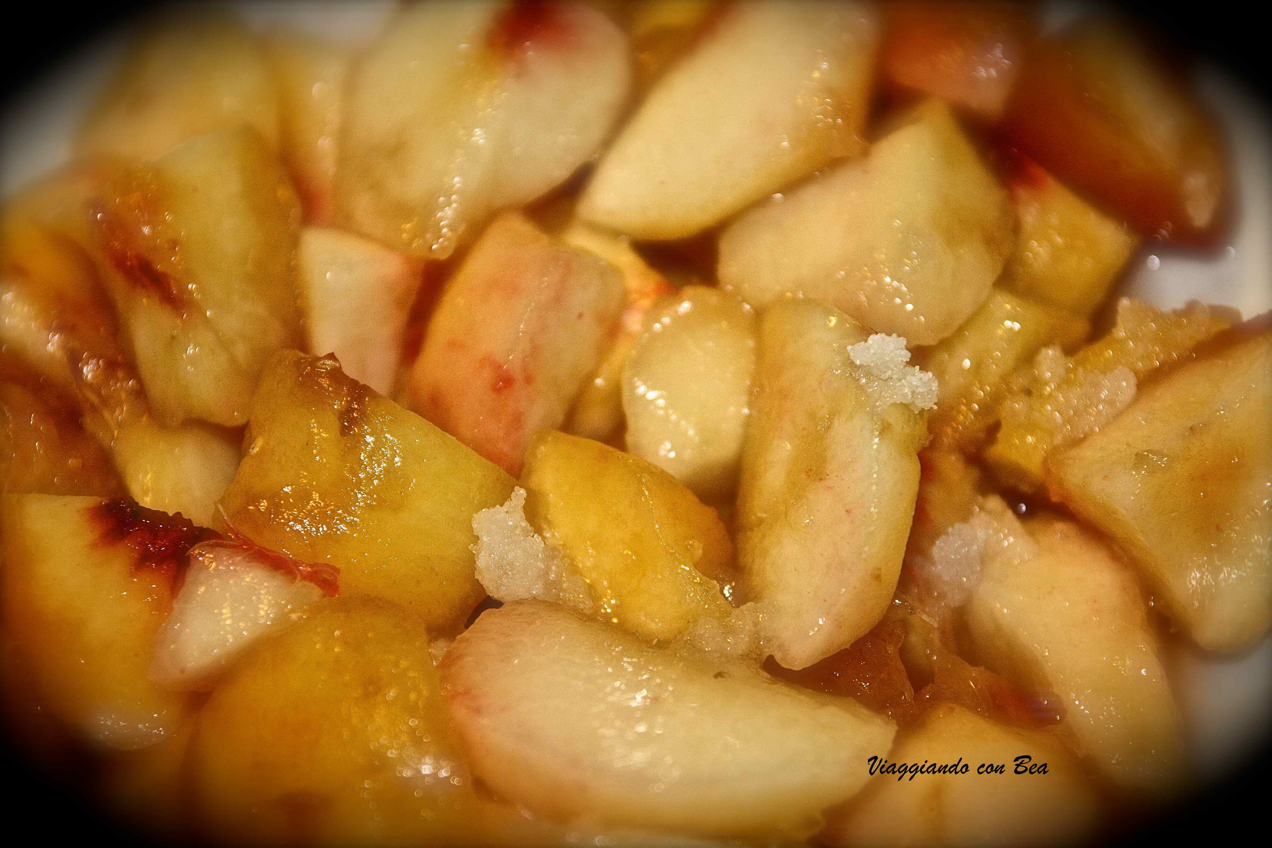 • pelare le pesche, tagliarle a tocchetti, irrorare con il succo di 1/2 limone, spolverizzare con un po’ di zucchero e riporre in frigo