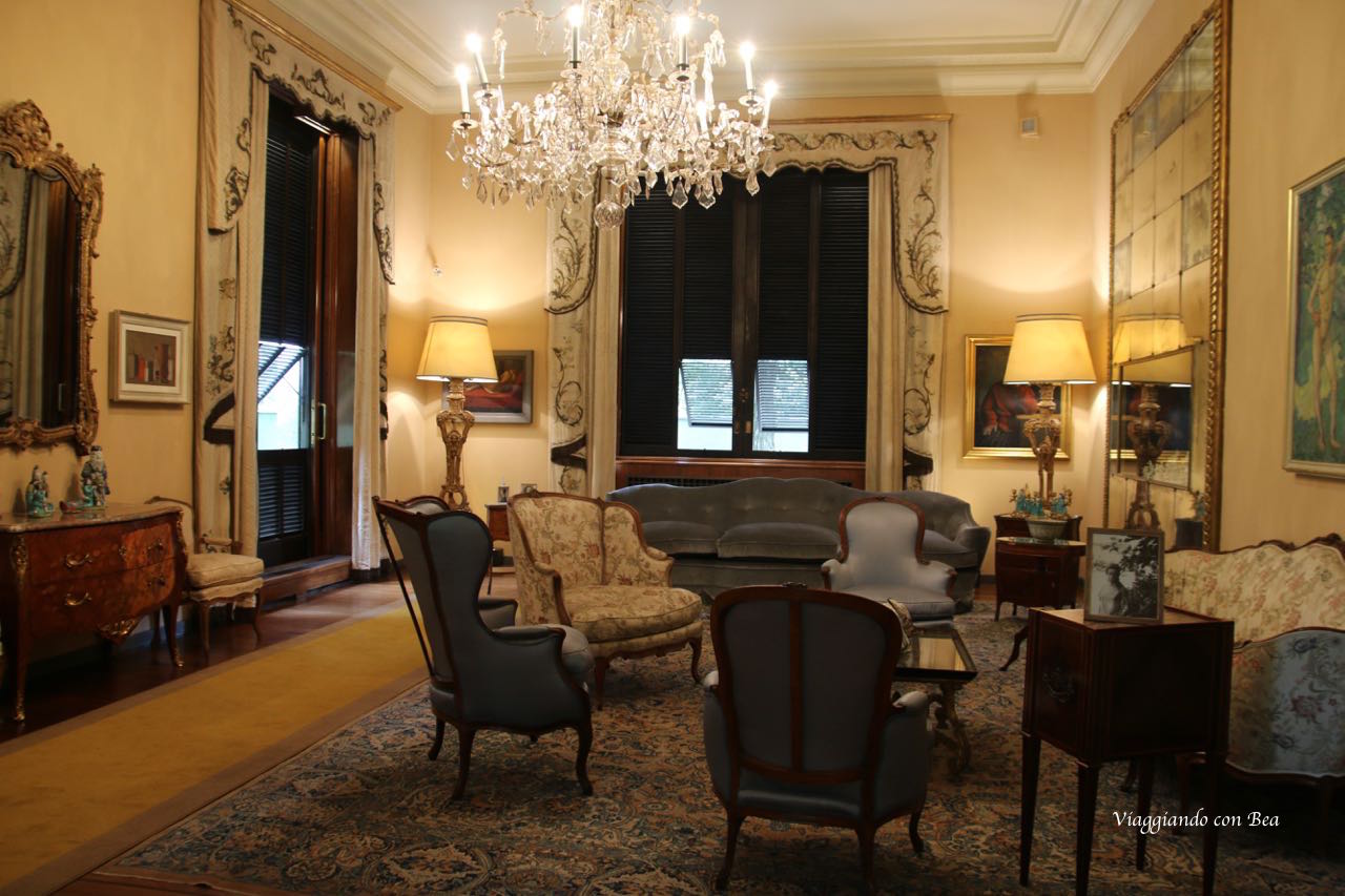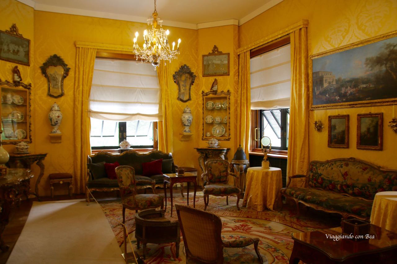 Dalla biblioteca si accede al Salone dove troviamo delle linee più morbide dovute all’architetto Tomaso Buzzi che subentrò a Portaluppi nel secondo dopoguerra e conferì a molti ambienti della Villa un aspetto più classico. Nel salone troveremo dei pezzi di arredo che ricordano lo stile Luigi XV e Luigi XVI, il tutto arricchito da tendaggi ed importanti opere della Collezione Claudia Gian Ferrari.
