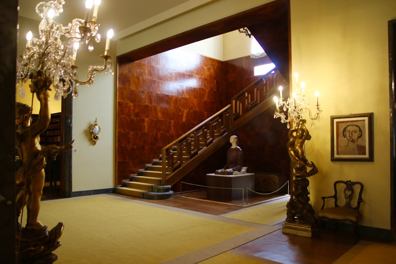 Librerie in palissandro nella calda atmosfera della biblioteca. Volgiamo lo sguardo all’insù, impossibile non notare i soffitti con quell’intreccio di costolature a forma di rombo, tanto cari a Portaluppi che li propone non solo in molti ambienti della villa ma anche nei più piccoli dettagli decorativi di alcuni dei suoi mobili.