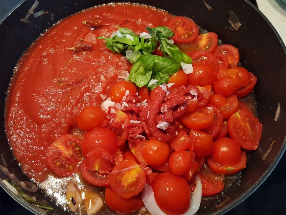 - A parte tagliare a tocchetti i pomodorini, aggiungere qualche foglia di basilico, la passata mutti, olio e fiocchi di sale a piacimento.