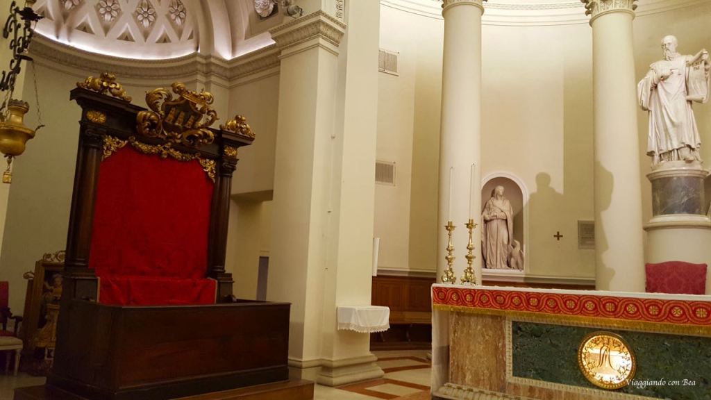 Interno a tre navate separate fra loro mediante sedici colonne corinzie. Soffitto della navata centrale a volta a botte, decorato a cassettoni con fiori bianchi in rilievo. L’urna di San Marino è racchiusa nell’abside dietro l’altare maggiore. In una teca a destra, è conservato il reliquiario in argento.