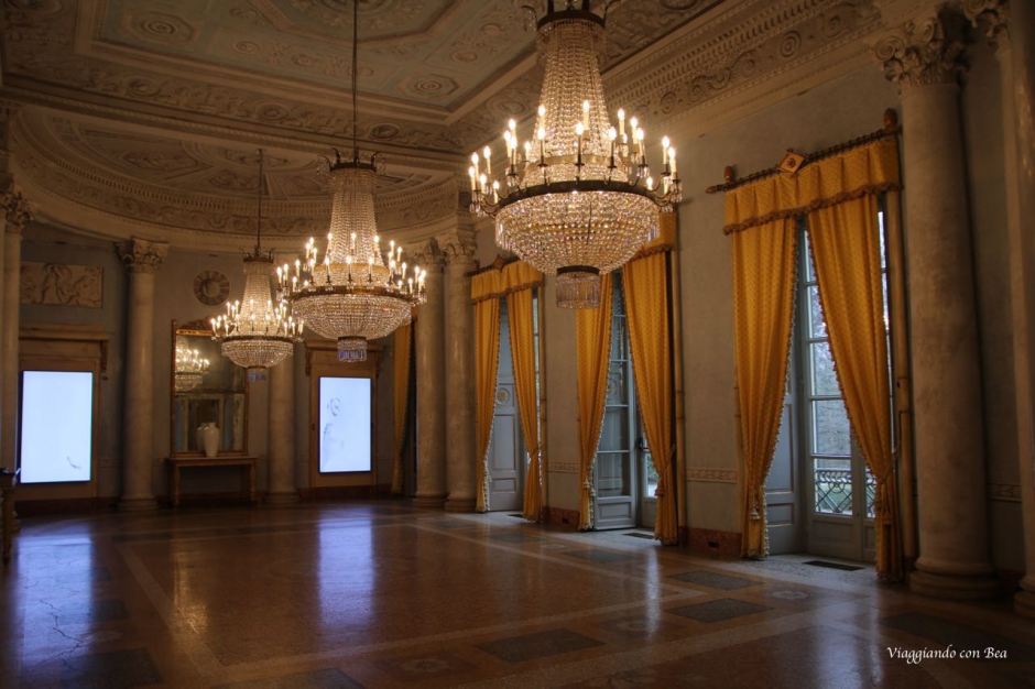 Uno degli ambienti che mi ha maggiormente affascinato è il Salone Impero. La forma ovale della sala sembra avvolgerti in un grande abbraccio. Lampadari di cristallo scintillante penzolano da soffitti riccamente decorati, colonne e drappeggi, il tutto contribuisce ad alimentare la mia fantasia ed ero lì lì per fare una piroetta al suono di una musica immaginaria.