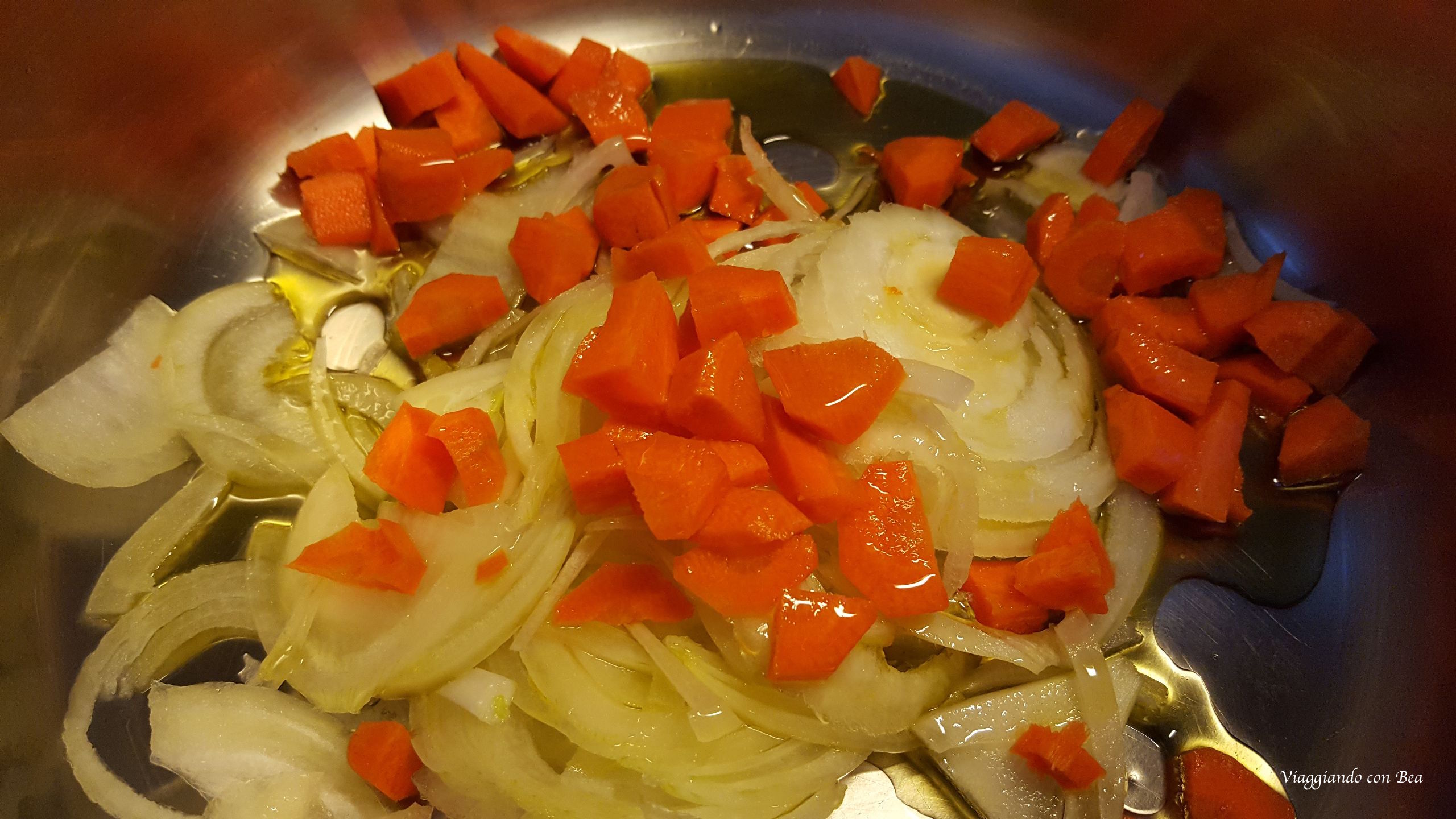 - far rosolare, in una padella antiaderente, la cipolla e la carota tagliata a tocchetti
