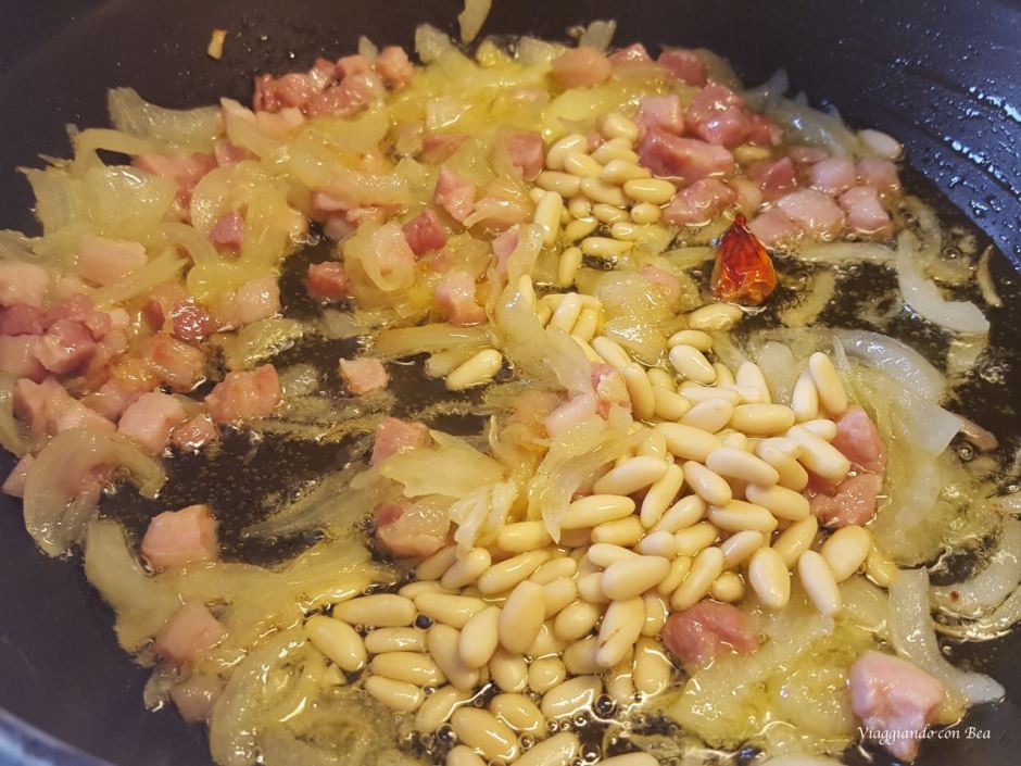 - affettare finemente la cipolla e rosolarla con la pancetta dolce, i pinoli ed olio evo q.b.