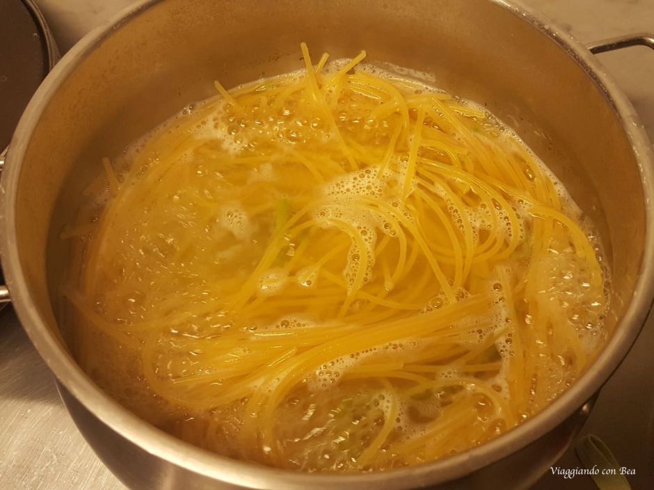 - per la cottura degli spaghetti utilizzare il rimanente brodo e tenere dell’acqua calda pronta da aggiungere durante la cottura
