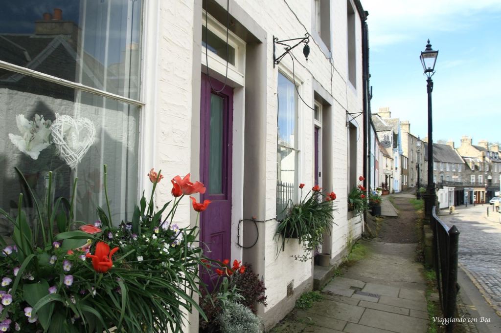 Con quella brezza che ti scompiglia i capelli, con quella giornata così carica di sole e luce non possiamo non concederci una passeggiata lungo i vicoli acciottolati di South Queensferry. Le casette traboccano di fiori e ci ammaliano.