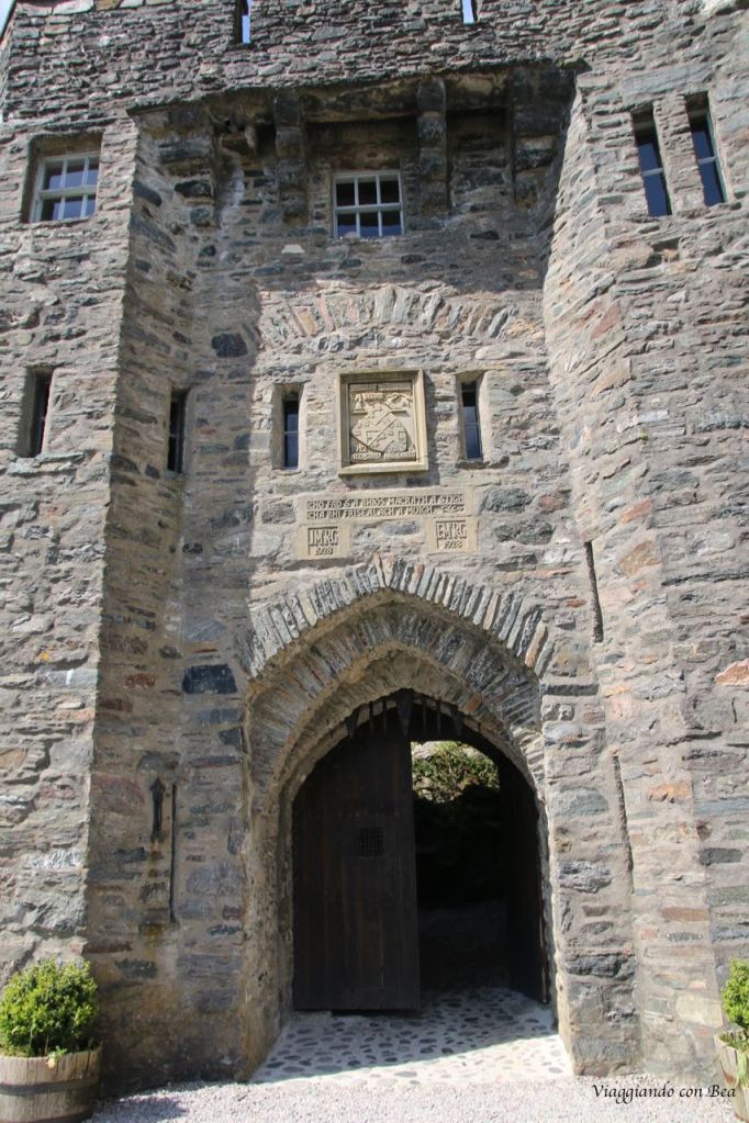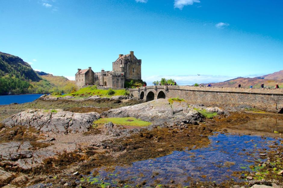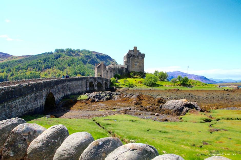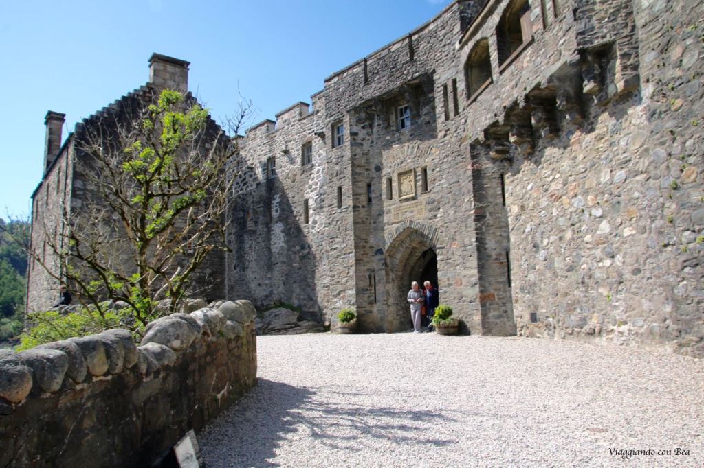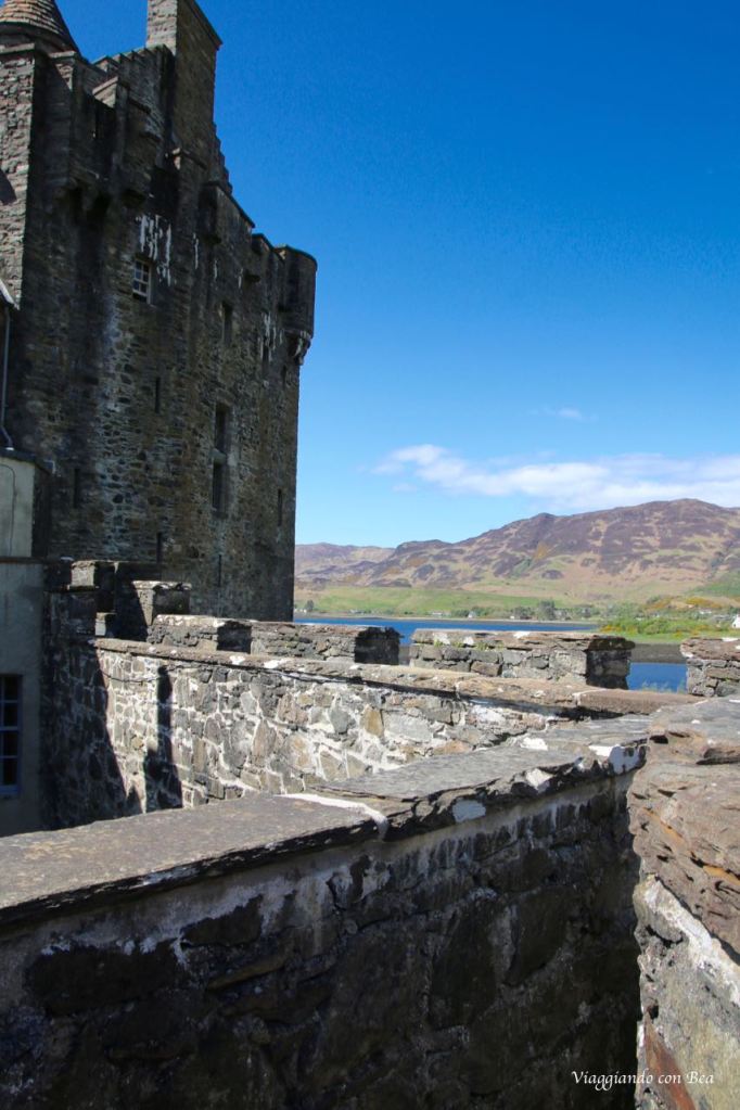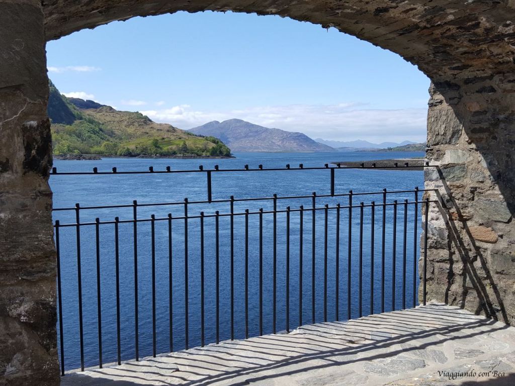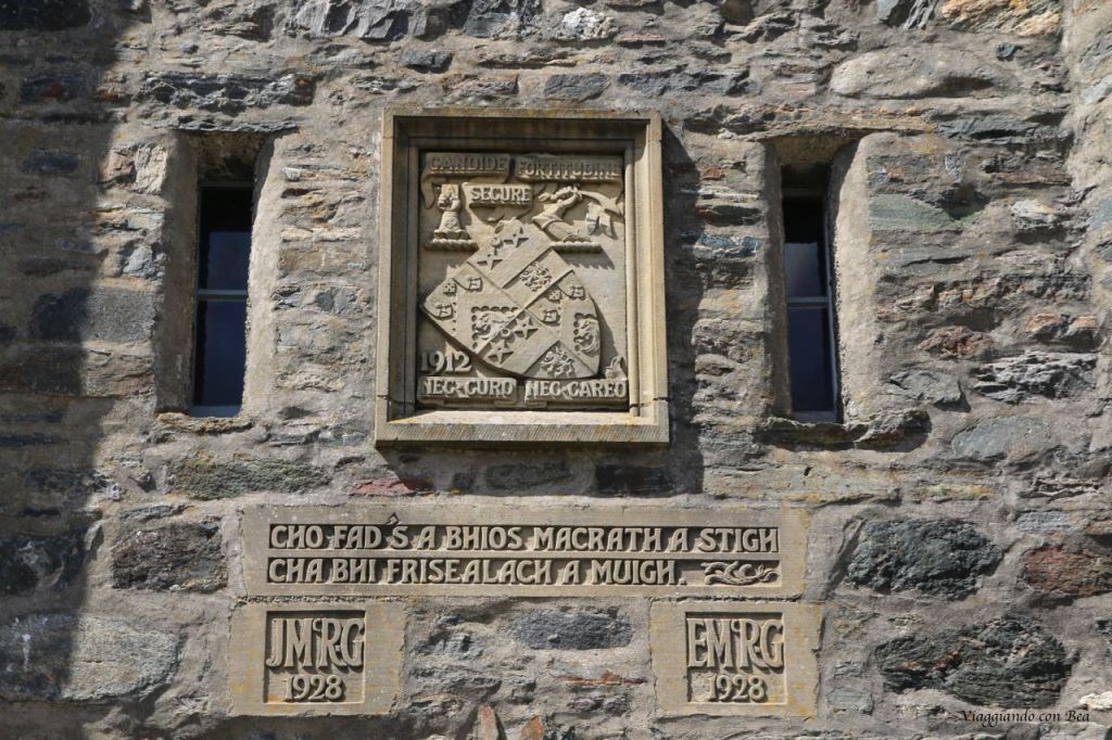 Impossibile non fotografarlo ripetutamente per catturare in uno scatto quello scenario incredibile.  Uno scenario fatto di laghi e verdi colline. Se ne sta solitario abbarbicato sull’isola di Donan, come a voler, ancora oggi, controllare i versanti boscosi delle terre di Kintail. Il castello venne costruito, intorno al 1220, a scopo difensivo contro le continue incursioni da parte dei vichinghi. Più volte rimaneggiato nel corso dei secoli, venne completamente raso al suolo nel 1719 durante una delle insurrezioni giacobite per l’indipendenza della Scozia. Per oltre 200 anni rimase in uno stato di completo abbandono fino a quando, nel 1911, il Tenente Colonnello John MacRae-Gilstrap acquistò l’isola e, dopo vent’anni di importanti opere di restauro, lo riportò al suo antico splendore. Venne riaperto nel 1932 ed oggi, varcando il portale, se volgiamo lo sguardo all’insù, la nostra amica blogger Bea ci fa notare quella scritta in gaelico che dice “finchè c’è un MacRae all’interno, non ci sarà mai un Fraser all’esterno“.