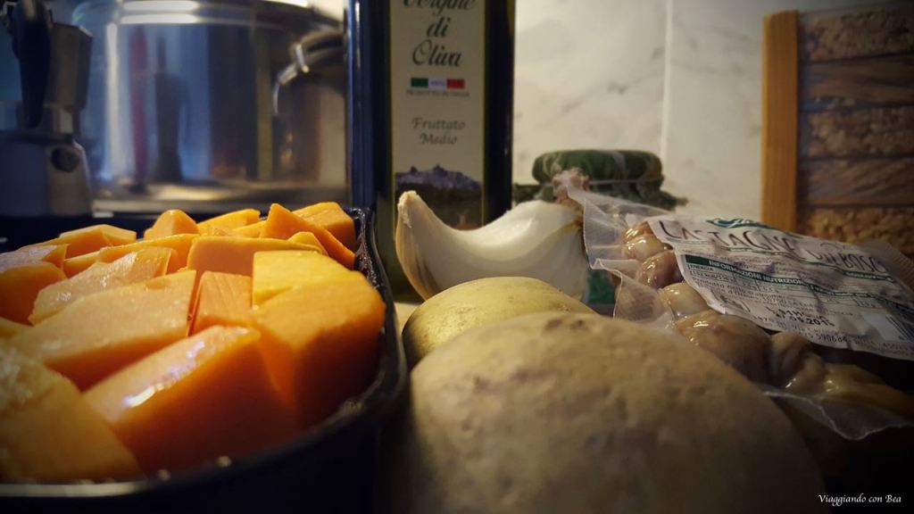 Nella scorta vedo una confezione di castagne sottovuoto, in frigo un pezzetto di zucca non manca mai e quindi direi proprio che con poche mosse questa sera si può gustare una vellutata dal gusto dolce e avvolgente.