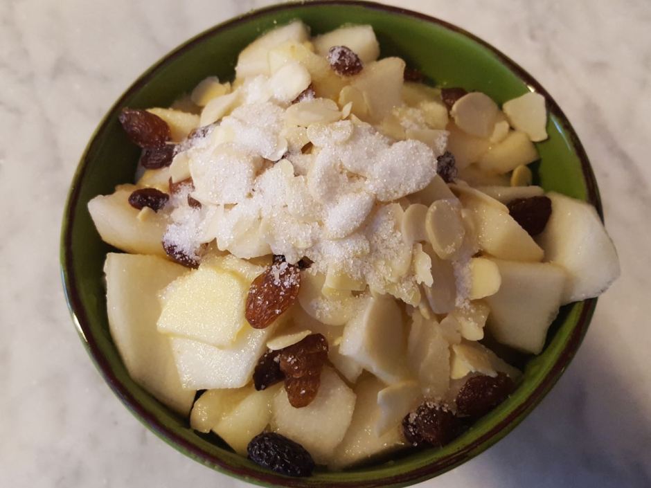 - Metterle in una ciotola con il succo del limone, l’uvetta passita, le scaglie di mandorla ed il cucchiaio di zucchero