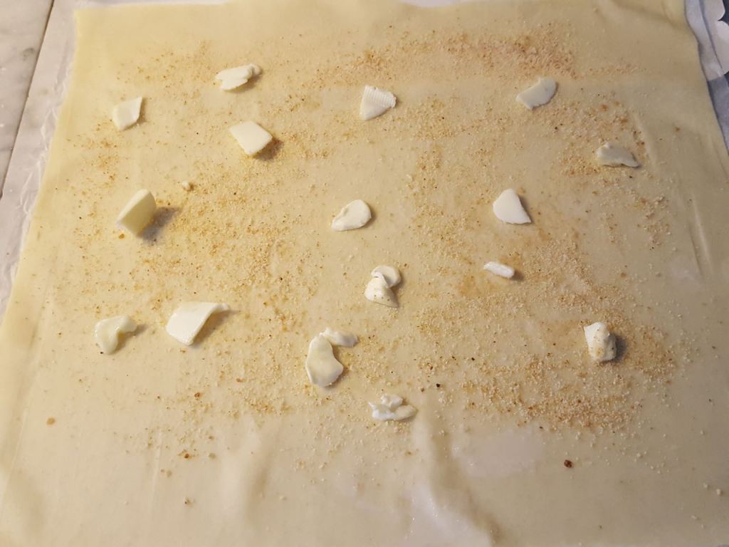 - Nel frattempo stendere la pasta sfoglia in modo da renderla più sottile e spolverizzarla con pan grattato e qualche fiocchetto di burro