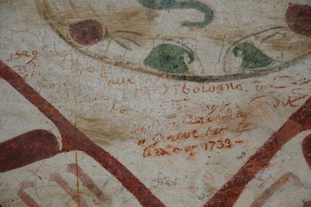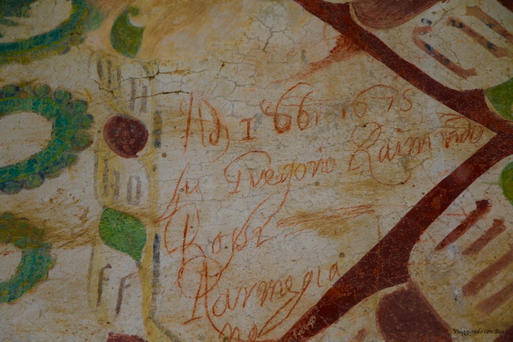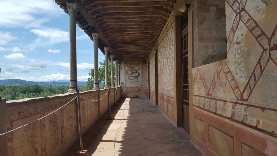 Ultimata la visita delle quattro sale principali del piano terreno, si esce sul loggiato. Soffitto con travetti in legno, pareti e balaustre magnificamente affrescati, stemmi ovunque che ci ricordano le famiglie che qui si sono succedute nel corso degli anni. E ancora una volta, sulla parete in fondo al loggiato, spicca la “bissa bella” ovvero il biscione che rappresenta la famiglia dei Visconti. Ciò che maggiormente cattura lo sguardo del visitatore sono quei graffiti incisi in modo indelebile sulle pareti. Un susseguirsi di frasi, ognuna con la propria data, che ci raccontano importanti avvenimenti del passato che hanno segnato la storia del Castello.