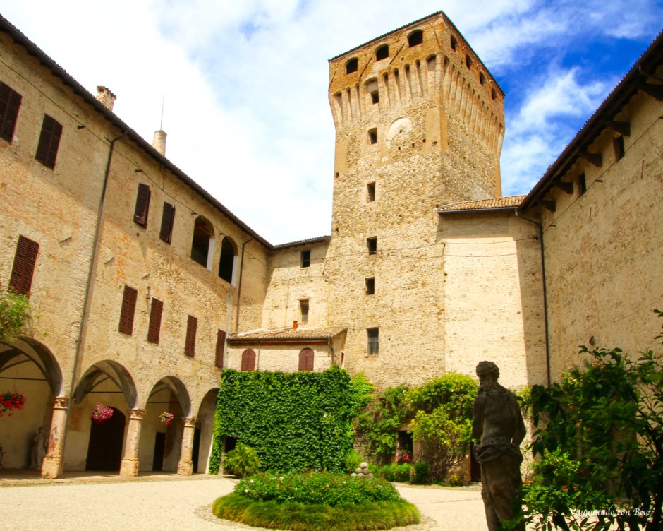 Prima di salire quei gradini che ci portano verso il camminamento di ronda lasciamoci affascinare dai racconti di Paola ed ascoltiamo la leggenda che aleggia tra queste mura. Si racconta che nel maggio del 1593, durante una festa organizzata nel castello, apparve una fanciulla che allestì un banchetto per predire il futuro a chi lo volesse conoscere. Si avvicinò Pio, figlio del conte Pomponio Torelli, e la bellissima Bema, cadendo in trance, vide, con ben diciotto anni d’anticipo, un lago di sangue.
