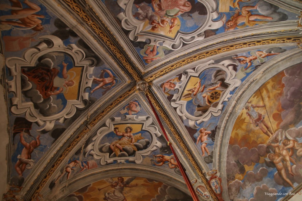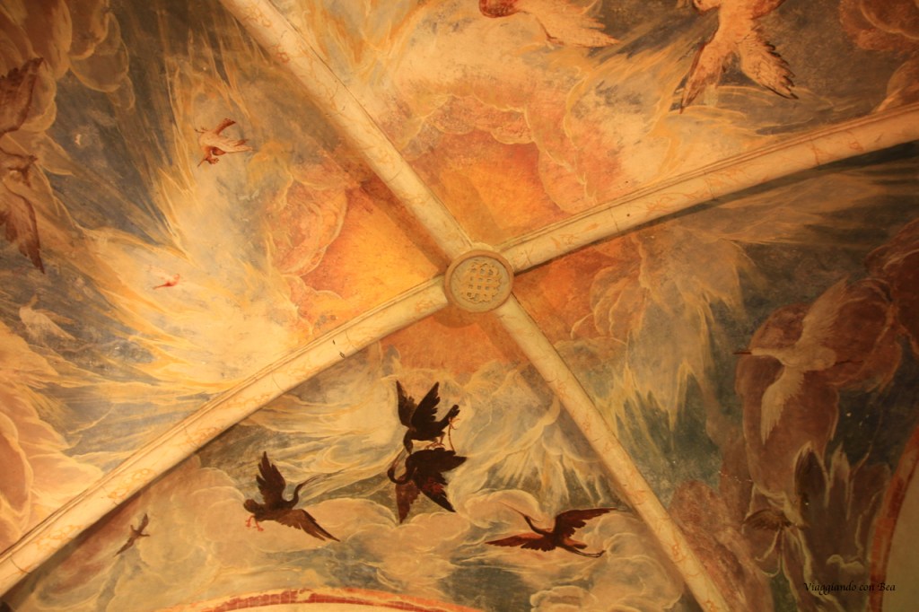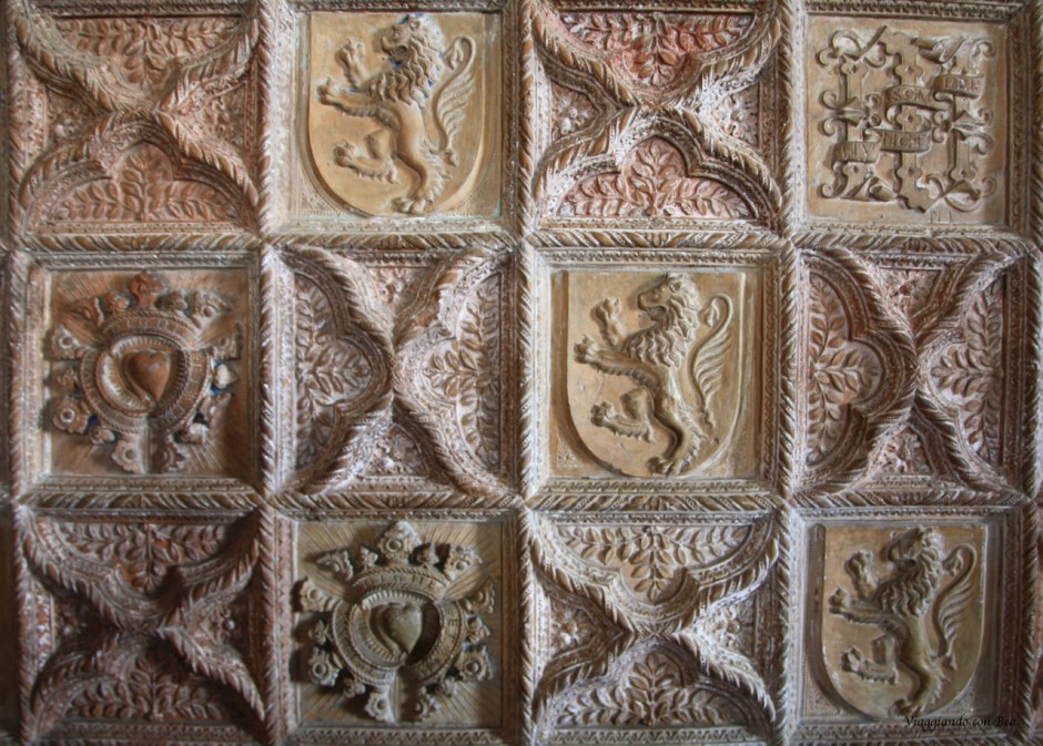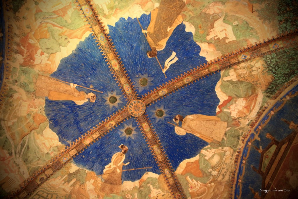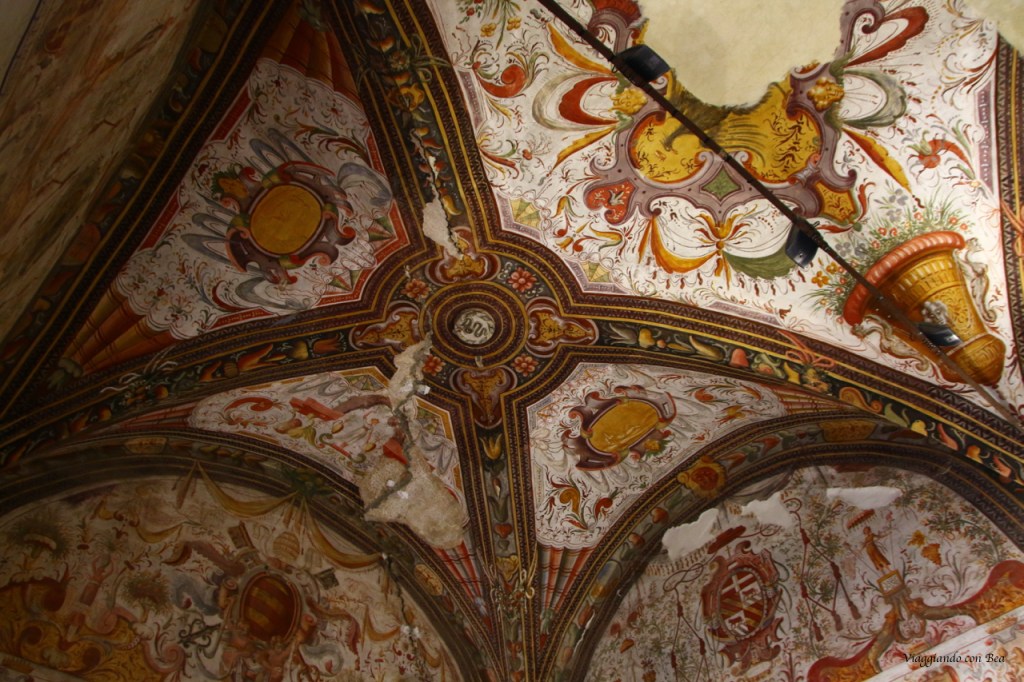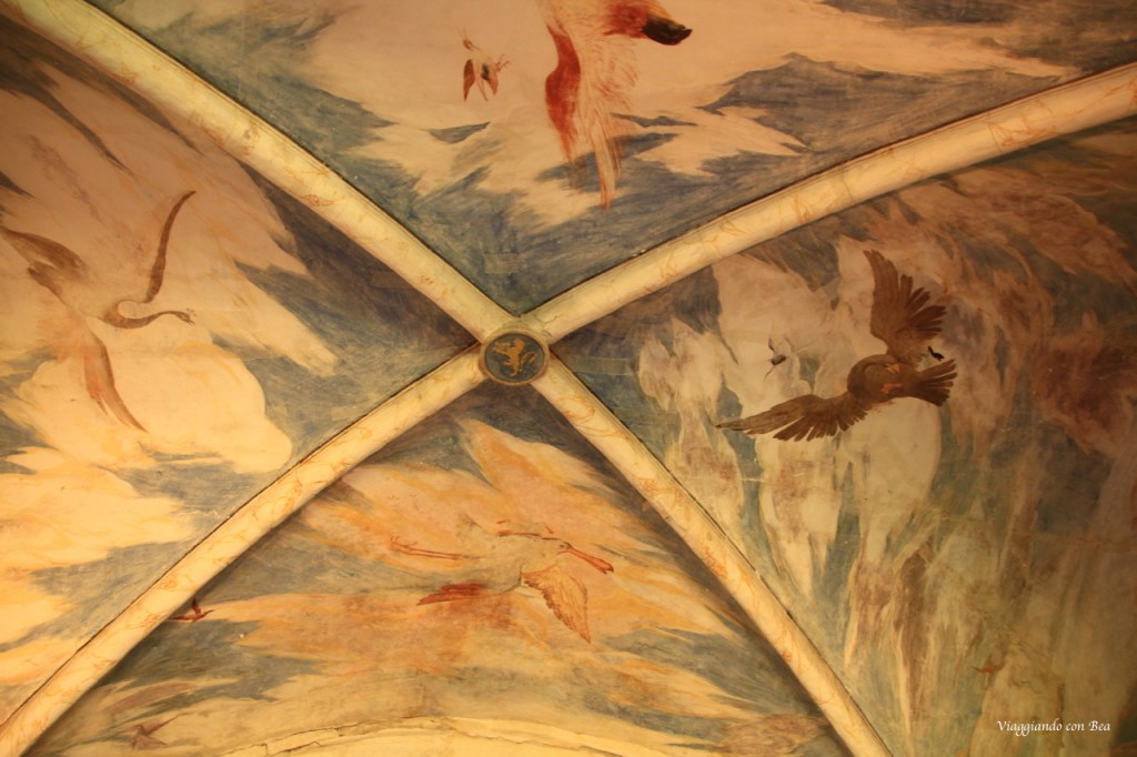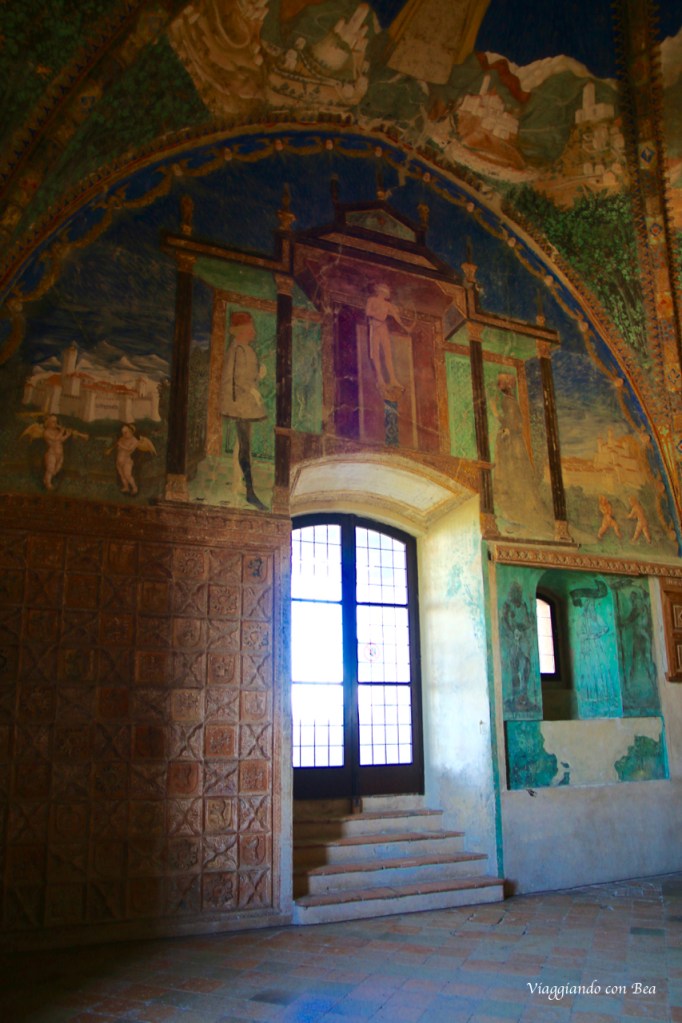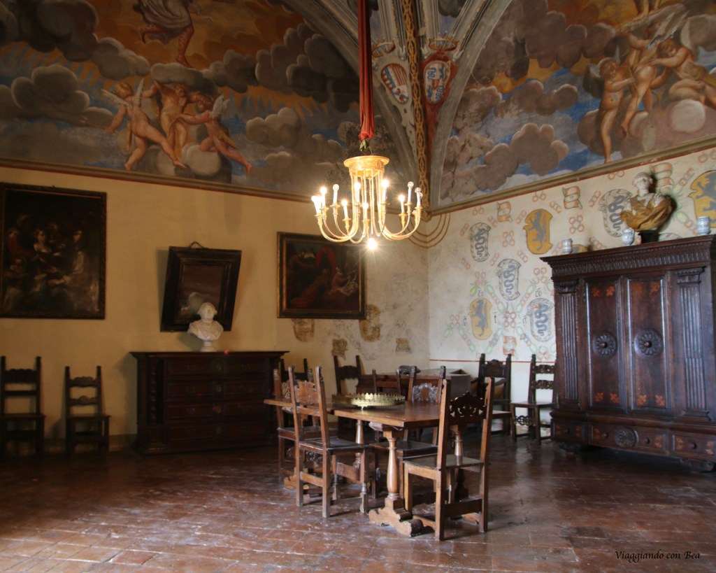 Ancora qualche scatto ed il mini gruppo accede a sale ricche di dipinti ed antichi arredi. Direttamente collegato al cortile d’onore troviamo il Salone delle Feste illuminato da trifore neogotiche. Le volte a crociera sono decorate da affreschi realizzati nel XVI secolo ed attribuiti alla scuola di Cesare Baglioni. Ovunque giri lo sguardo è un susseguirsi di affreschi e stemmi tra i quali non si può non notare il biscione visconteo.