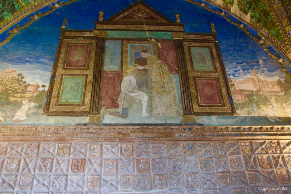 Il primo particolare che balza all’occhio del visitatore sono le formelle in terracotta, in origine dorate, che rivestono le pareti. Le formelle riportano motivi di stemmi e le iniziali intrecciate di Pier Maria Rossi e Bianca. Ogni dipinto presente sulle pareti o nelle volte parla di questa grande storia d’amore.