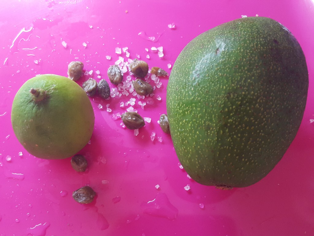 - tagliare a tocchetti l’avocado, irrorare con il succo di 1/2 lime ed aggiungere una manciata di capperi