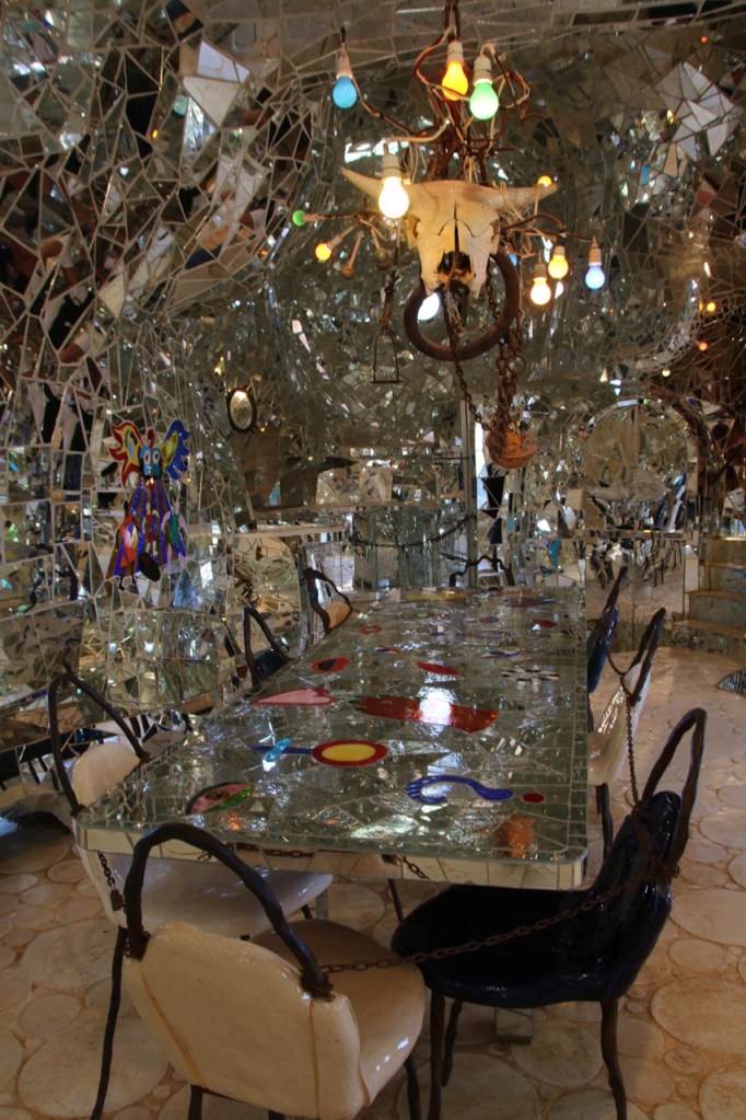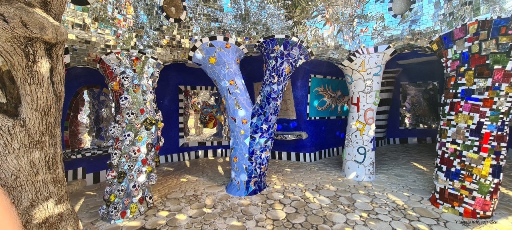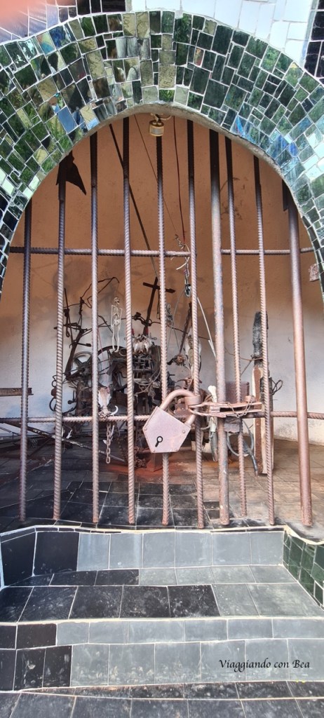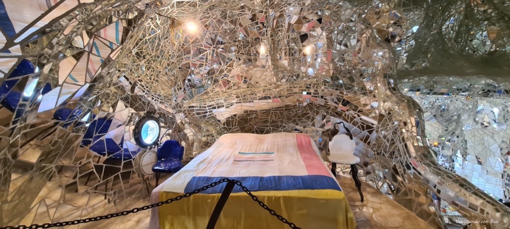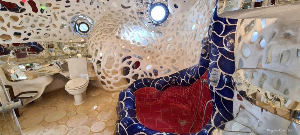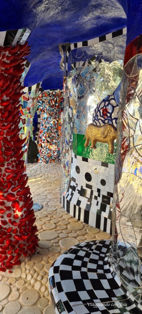 con il suo castello immaginario fatto di torri, un vero e proprio camminamento di ronda, un cortile ed un tripudio di colori con colonne rivestite di mosaici di ceramica e frammenti di specchi.