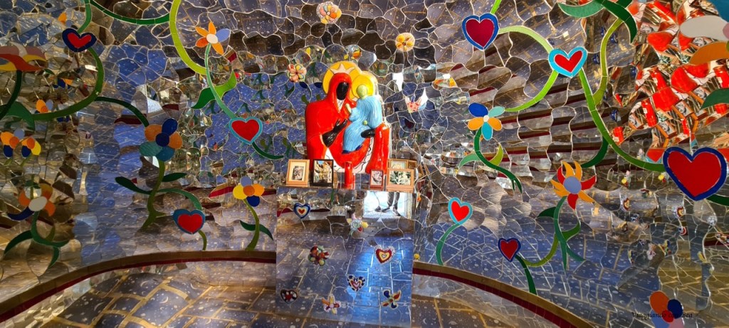 Una piccola scultura a forma di igloo che rappresenta la Temperanza si presenta davanti ai nostri occhi. Al suo interno è stato collocato un piccolo altare con le foto di amici scomparsi. Leggo su internet che questa struttura è dedicata alla memoria del marito di Niki e di un suo carissimo collaboratore.