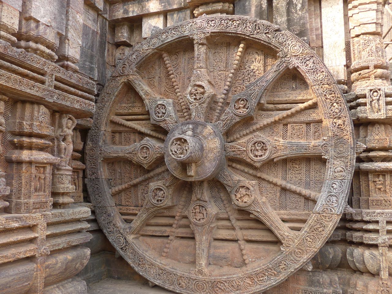 Il viaggio continua verso Konark dove è sicuramente imperdibile la visita al tempio dedicato al Dio Surya o Dio del sole. Ci sono voluti 12 anni e ben 12.000 artigiani per edificare il grande carro celeste di Konark.  E’ uno dei sette templi presenti in India dedicati al Dio Sole. Questo edificio religioso, importante santuario per il brahmanesimo, risale al XIII secolo e venne costruito dal re Narasimhadeva. Leggo su internet che i marinai, vedendolo dal mare, lo chiamarono la Pagoda Nera.  Il tempio è stato concepito come una raffigurazione del carro cosmico del Dio del Sole. I sette cavalli simboleggiano i giorni della settimana. La base del tempio poggia su 24 ruote che simboleggiano le ore del giorno. Con tutti quei bassorilievi, con evidenti scene erotiche, che lo arricchiscono è sicuramente il tempio più bello dedicato al Dio Sole e non poteva di certo non essere inserito nell’elenco dei Patrimoni dell’umanità dell’UNESCO.