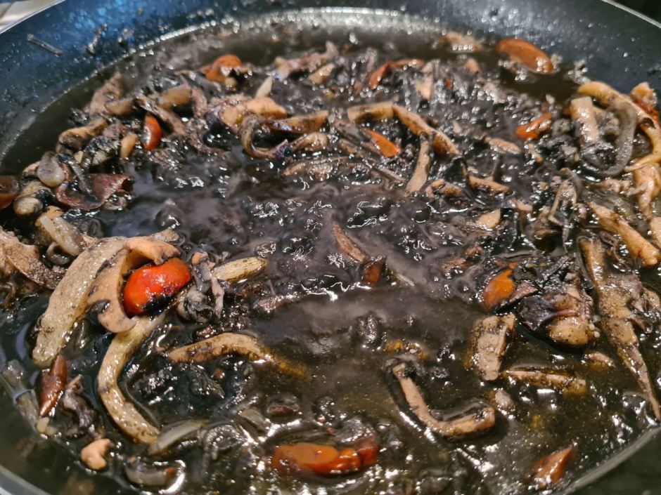 - quando le seppie risulteranno tenere ed il sughetto si sarà addensato aggiungete il nero di seppia ed amalgamare il tutto (attenzione a non schizzarvi ed usate i guanti mi raccomando)