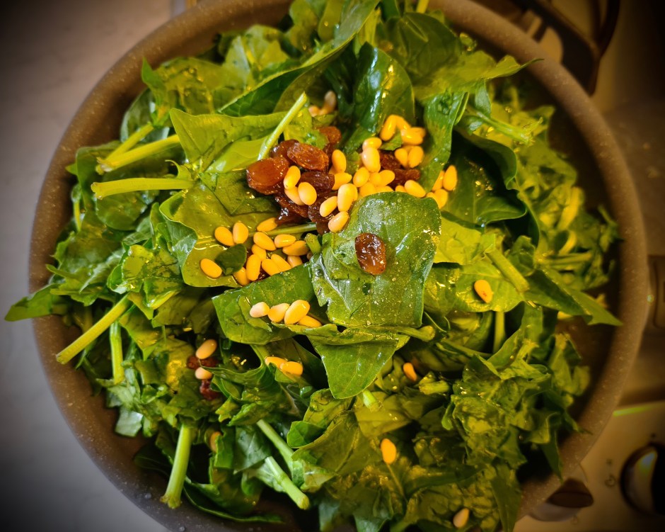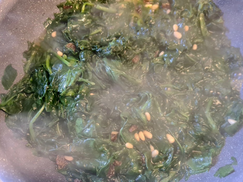 - lavare gli spinaci, strizzarli bene e riporli in una padella con olio, uva passita, pinoli e del sale