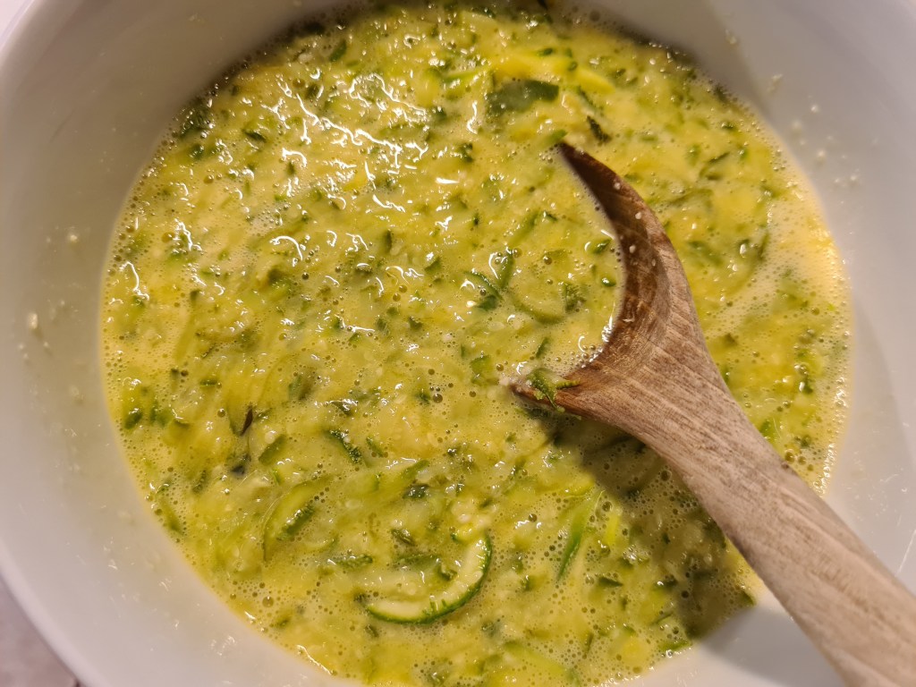 - in un tegame far riscaldare un filo d’olio e versare il composto di uova e zucchine