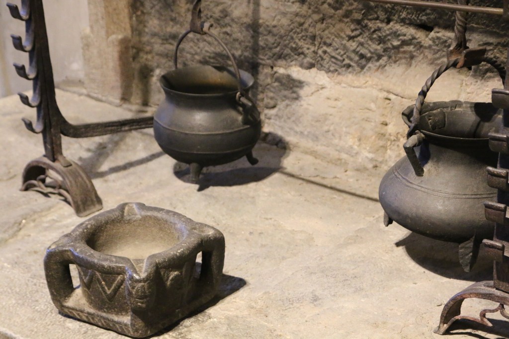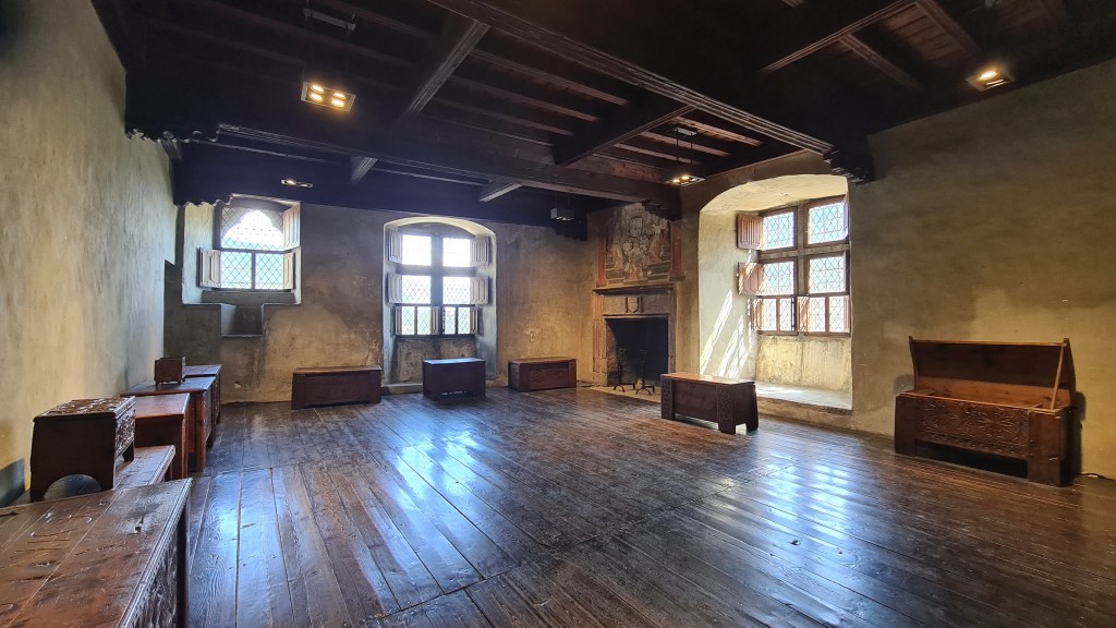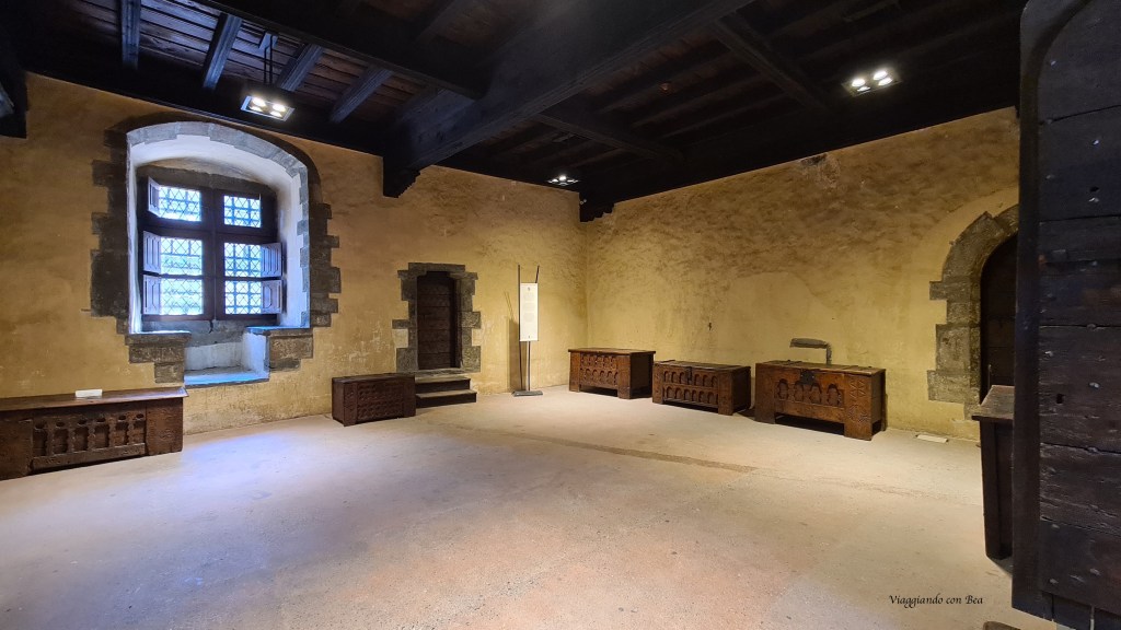 Il corpo centrale del castello, con le sue torri circolari agli angoli e quadrate al centro, forma un pentagono. Accedendo alle sale interne del castello, ti accorgi che stai guardando delle sali enormi senza nulla che rievochi gli antichi sfarzi e la guida ci lascia supporre che lì … probabilmente c’era la cucina e là … forse c’era la dispensa.