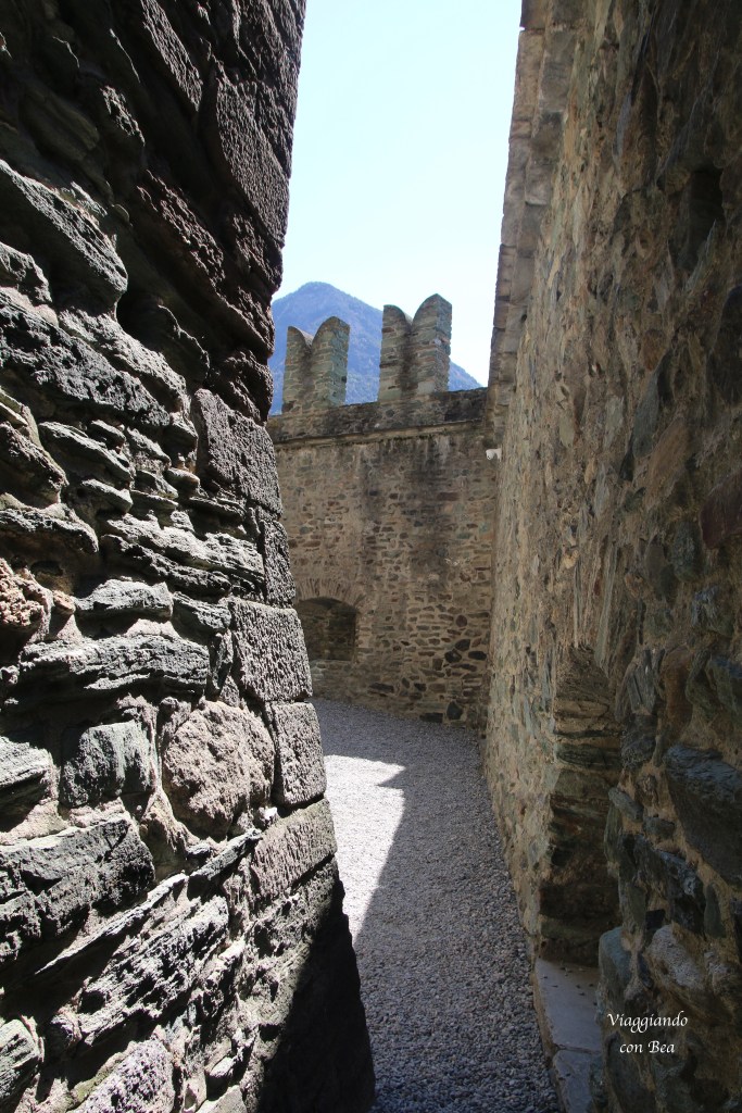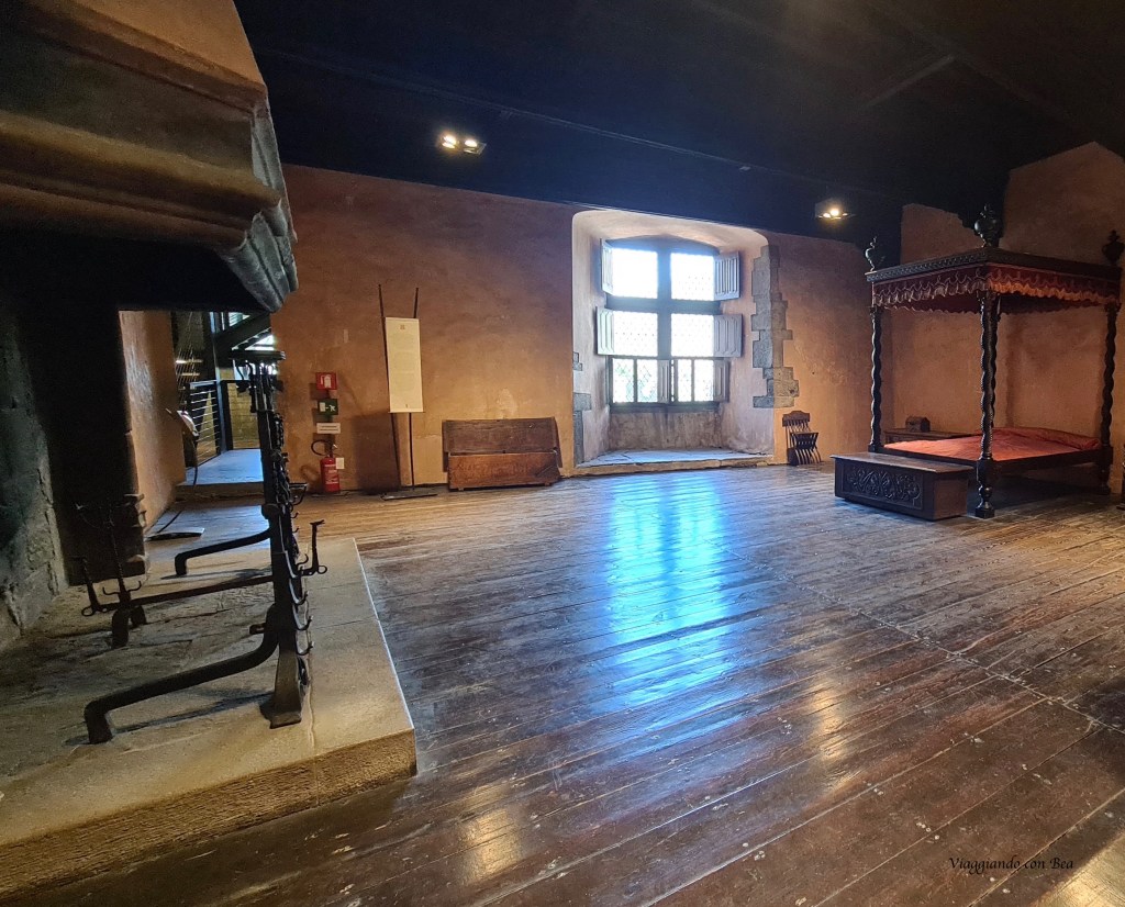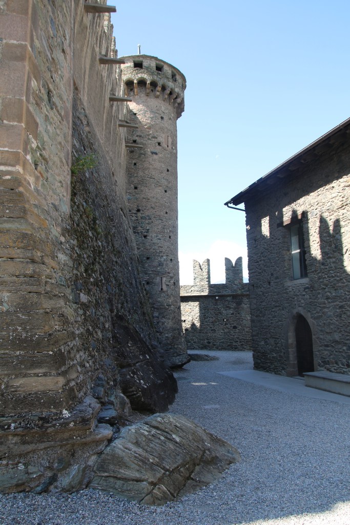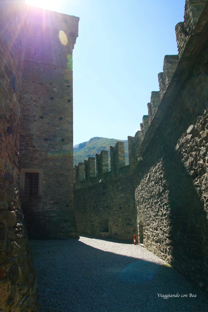 Il Castello di Fenis è uno di quei castelli che solo a vederlo, con quel gioco di torri e mura merlate, ti fa sognare. Avevo letto che fosse il Castello più bello della Val d’Aosta ma invece, ahimè, è stata una piccola delusione. Mi ero immaginata un interno ricco di affreschi, sale grandiose dove, con un po’ di fantasia, avresti potuto immaginare la vita mondana che si svolgeva tra quelle mura. Fin dalla sua origine (intorno al 1242), il Castello è legato alla famiglia Challant che per ben tre secoli lo ha ampliato fino a regalarci l’aspetto di oggi. Sull’opuscolo illustrativo leggo che le trasformazioni più significative sono avvenute nel XIV secolo sotto la Signoria di Aimone di Challant. L’ambiente che maggiormente affascina il visitatore è il cortile con la scala semicircolare ed il loggiato in legno sul quale si affacciano le principali stanze del castello.