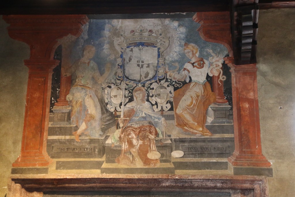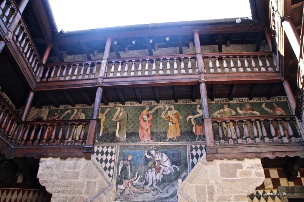 E’ giunto il momento di ammirare con attenzione il loggiato che da sul cortile. Al di sopra della scala è affrescato San Giorgio che libera la principessa, mentre lungo le pareti del loggiato vediamo un susseguirsi di personaggi con in mano dei cartigli. Dopo un susseguirsi di scatti salutiamo e ringraziamo la guida e con tutta calma ci dirigiamo verso la macchina.