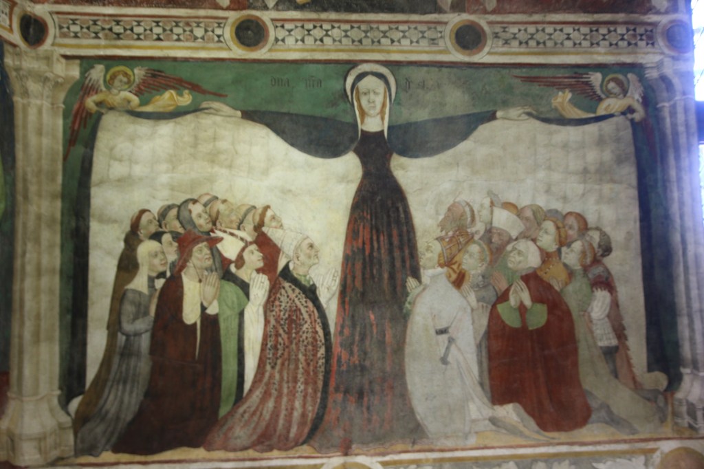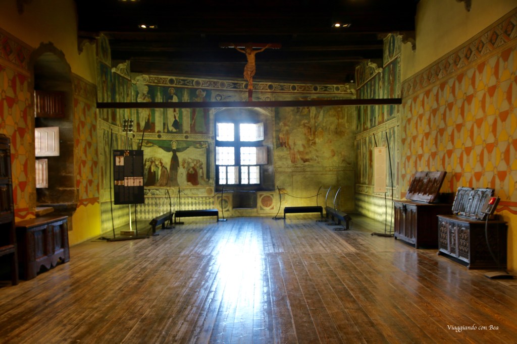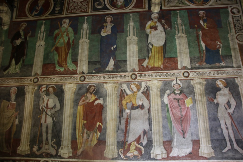 Si sale al primo piano e lì mi si apre finalmente il cuore nel vedere il salone con la bella cappella affrescata. Tra i tanti dipinti spiccano sicuramente gli affreschi realizzati attorno al 1416 dalla bottega del pittore Giacomo Jaquerio, principale esponente della pittura piemontese nella prima metà del Quattrocento. Le pareti laterali della cappella presentano le figure degli apostoli e di vari santi. Sulla parete orientale è dipinta a destra la Crocifissione e a sinistra compare la Madonna di Misericordia.