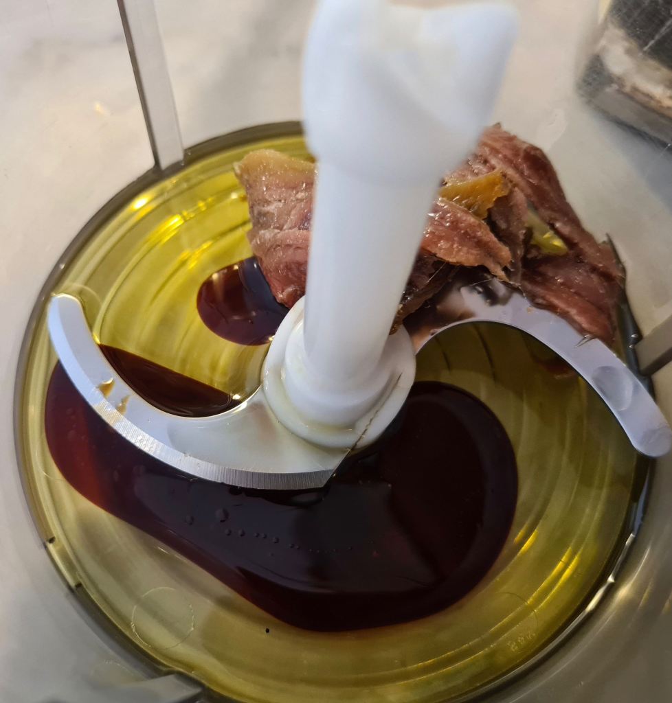 - riporre nel mixer 40 g di olio evo, 2 o 3 cucchiai di aceto balsamico e cinque o sei filetti di acciughe sott’olio