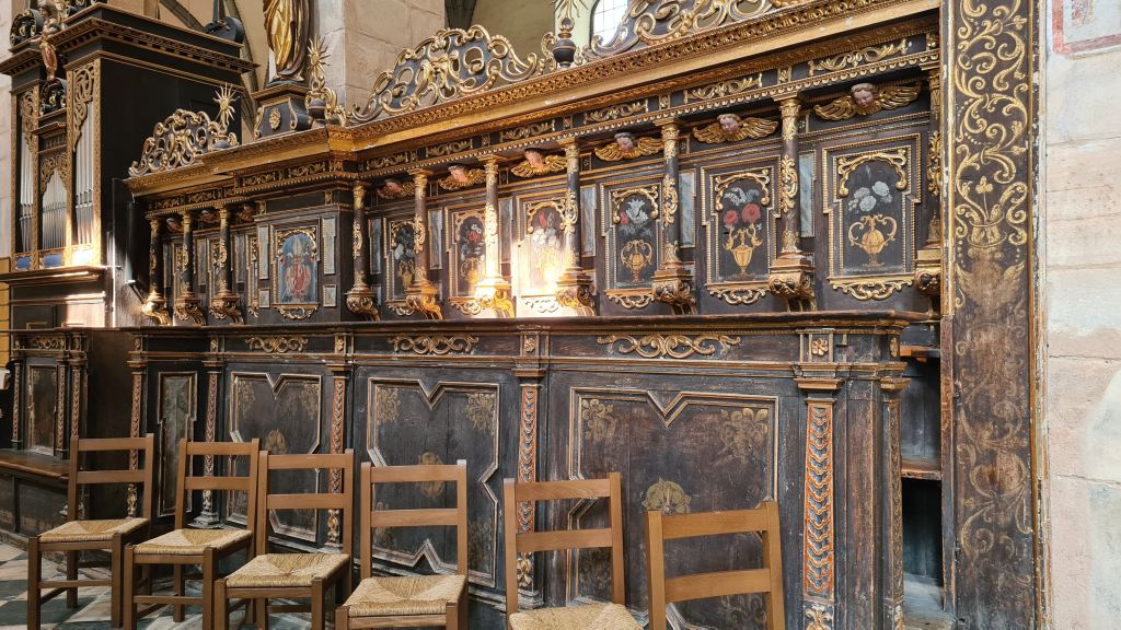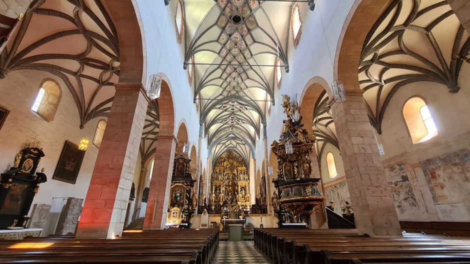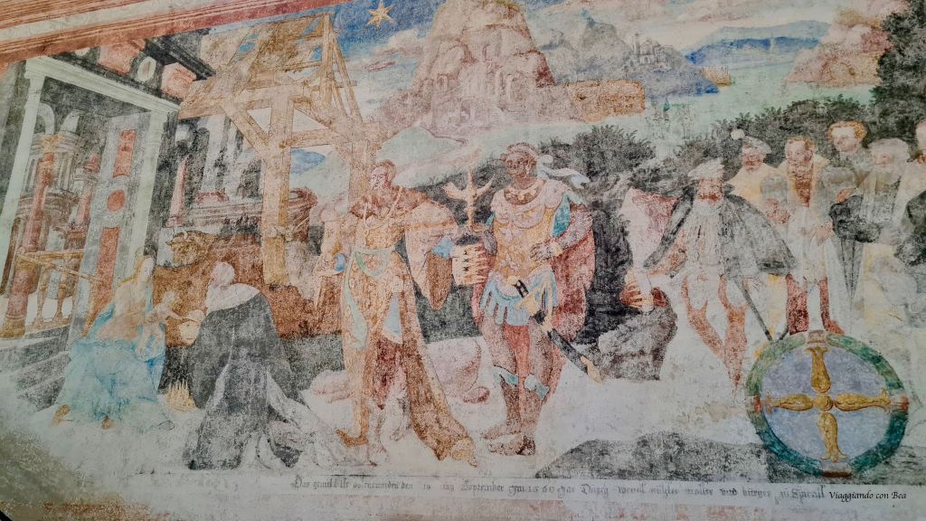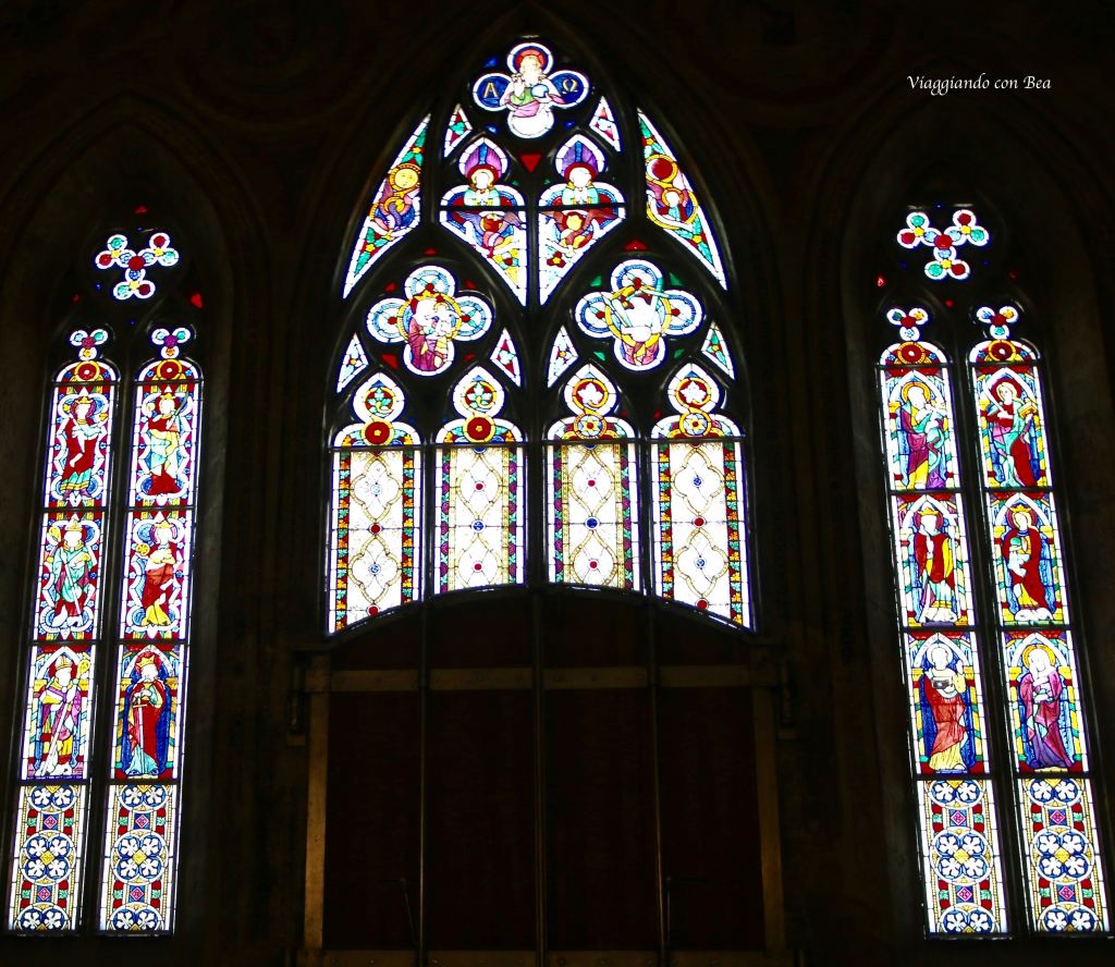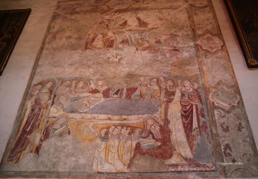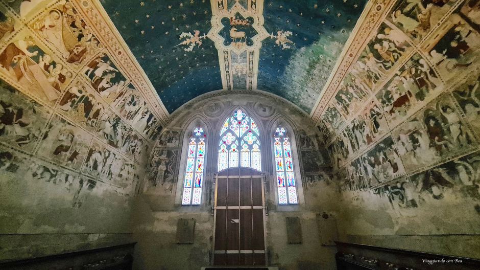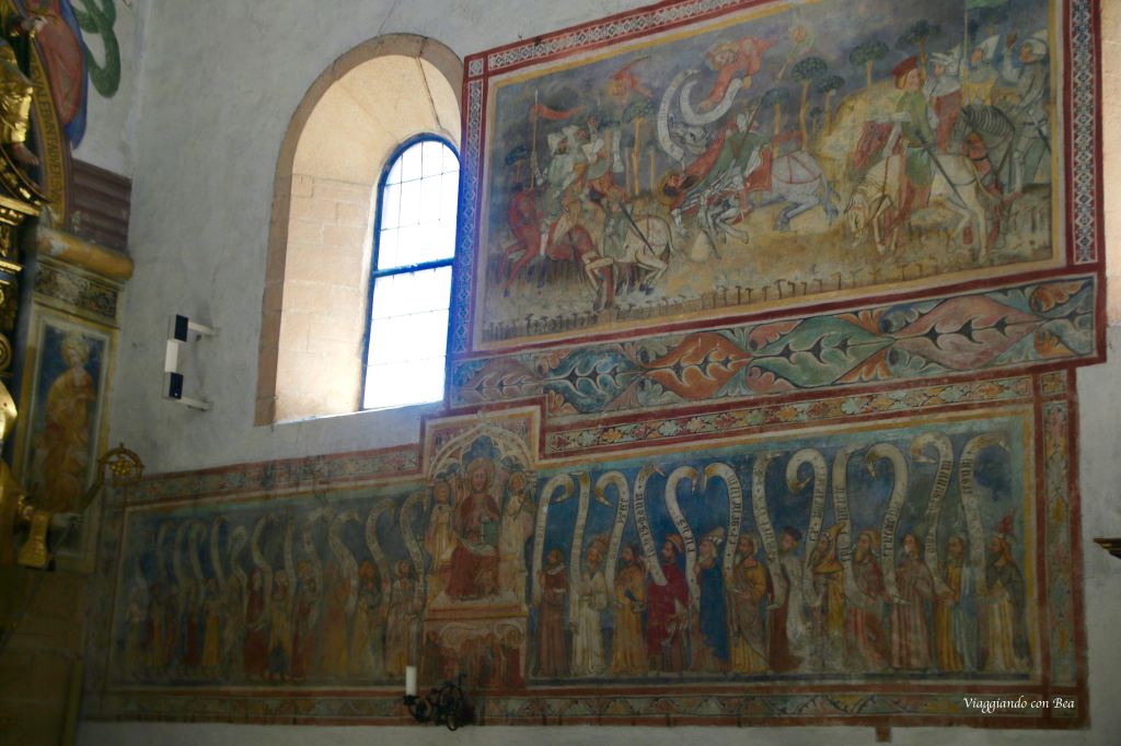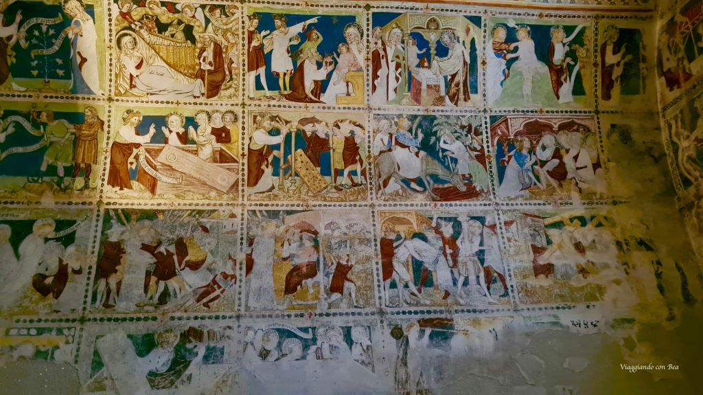 Avvolto nella penombra di una luce tenue che filtra da belle vetrate del XIV secolo, giriamo lo sguardo a 360° e tutt’intorno si susseguono bellissimi affreschi (1339 – 1343) raffiguranti scene del Vecchio e del Nuovo Testamento.