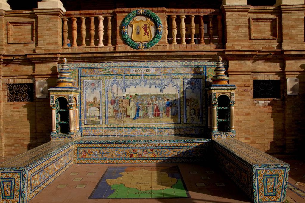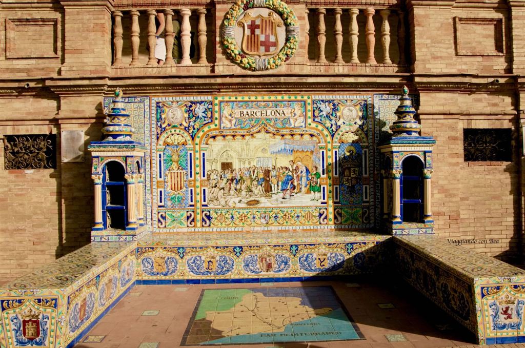 I pannelli in ceramica, decorati con piastrelle sivigliane e marmi, che circondano lo spazio centrale sono 48 e rappresentano le province spagnole.
