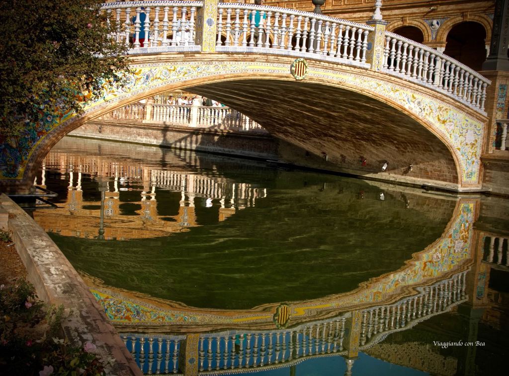 Sul canale che scorre lungo la piazza vediamo quattro ponticelli che rappresentano gli antichi regni di Spagna.