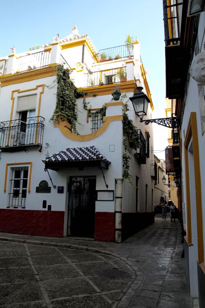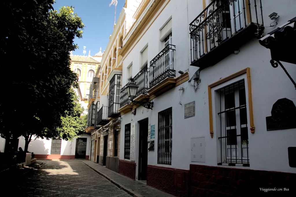 Dopo innumerevoli scatti il giro prosegue verso il Barrio de Santa Cruz, il quartiere più romantico e caratteristico di Siviglia. Un dedalo di tortuose stradine su cui si affacciano case dai muri imbiancati a calce ravvivate da davanzali fioriti. Stupendo perdersi tra quei vicoli e soffermarsi in piazze ombreggiate da aranci o sotto le facciate colorate di antichi palazzi. E’ affascinante sbirciare tra cancelli in ferro battuto e scoprire ombrosi cortili.