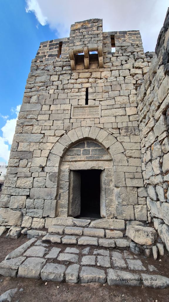 Poi finalmente, dopo aver percorso un centinaio di chilometri, ecco apparire all’orizzonte i blocchi di roccia nera basaltica sui quali si ergono le mura del Castello di Azraq (Qasr al-Azraq o Castello Blu), l’unico dei castelli visti che ha le sembianze di una vera e propria fortezza. La posizione di questo Castello era strategica in quanto sorgeva nei pressi di un’oasi, unica fonte d’acqua presente in questa vasta regione desertica. Purtroppo oggi di quell’oasi rimane ben poco. Non ci sono più palme o carovane che transitano da queste parti, ma autovetture che sfrecciano veloci. Le antiche origini della Fortezza Blu pare risalgano al 300 d.C. periodo che coincide con il dominio romano della regione. Un’iscrizione si riferisce all’imperatore Diocleziano che regnò tra l’anno 284 e l’anno 305.