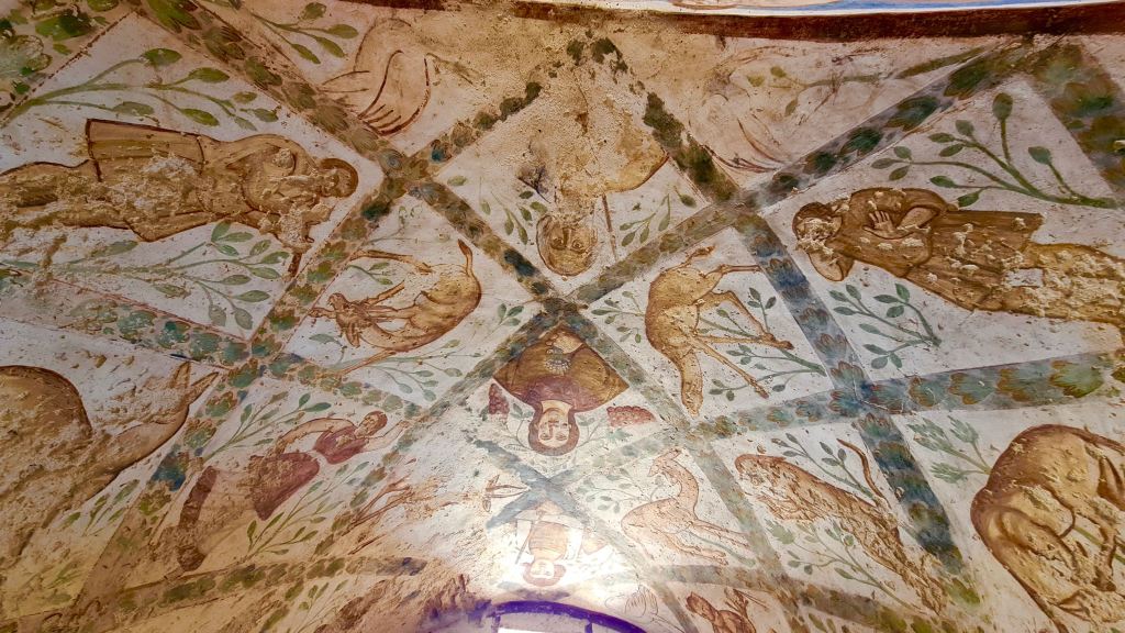 Il tutto è arricchito da splendidi affreschi probabilmente opere di artisti siriani o arabi. Abbagliati dalla luce esterna, quando si accede all’interno, si ha quasi l’impressione che gli affreschi siano sbiaditi ma poi, a poco a poco, gli occhi si abituano alla magia di quella luce soffusa e così gli affreschi appariranno in tutto il loro splendore. Ovunque scene di vita di corte con donne a seno nudo, suonatrici, cavalieri, arcieri. Magnifiche scene di caccia e poi ovunque alberi da frutto, frutta e vegetazione che infondono nel proprio io un vero senso di pace.