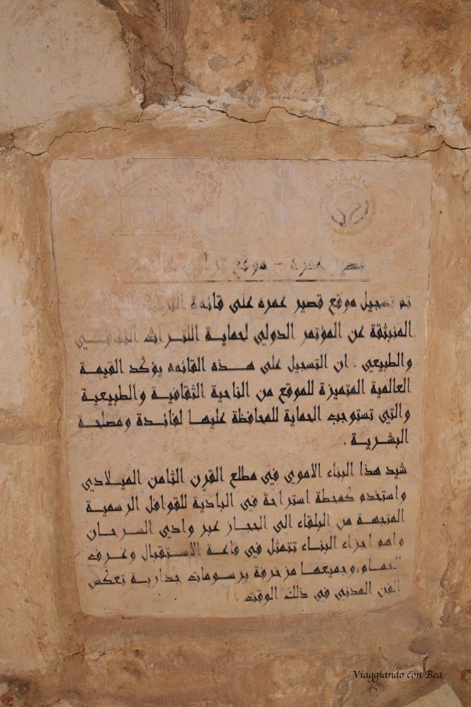 Pare sia il più famoso tra i Castelli del Deserto nonostante la sua struttura piccola e modesta. Con la sua semplicità, nel 1985, l’Unesco ha dichiarato Qusayr Amra Patrimonio dell’Umanità. Nella mia guida touring leggo che questo Castello, uno dei monumenti Omayyadi meglio conservati, è “un eccezionale documento di arte islamica”, e come dargli torto!? E’ necessario entrare al suo interno per capirne la bellezza con quel susseguirsi di affreschi giunti quasi integri fino ai giorni nostri.