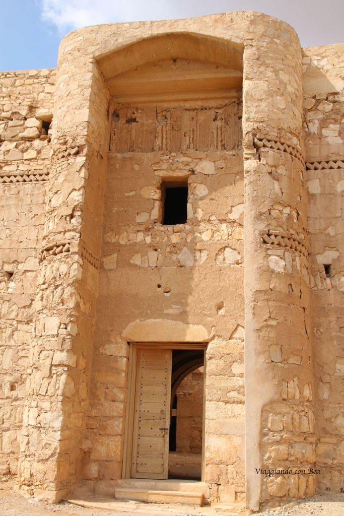Dinanzi a noi si presenta maestosa e molto suggestiva la facciata del Castello di Kharanah. Secondo alcuni studi archeologici si presume che questo castello, edificato tra la fine del VII secolo e l’inizio dell’VIII secolo d.C., non poteva essere utilizzato né a scopi militari né come luogo per il ricovero di carovane e mercanti. Piuttosto si pensa che fosse luogo d’incontro per riunioni politiche tra i capi tribù e gli omayyadi. Il primo magnifico colpo d’occhio ci mostra una facciata da un colore quasi rosato che crea un tutt’uno con i caldi colori del deserto. La sua forma è quadrangolare con piccole torri arrotondate e due torri che fanno da cornice all’ingresso principale.