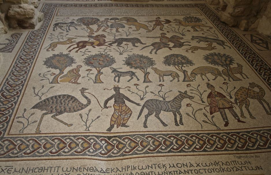 Un mosaico di tipo narrativo dove si distinguono chiaramente le scene rappresentate. Ad esempio nella prima fila di immagini notiamo un pastore che difende uno zebù e poi un soldato che trafigge una leonessa. Nella seconda fila due cacciatori a cavallo. Nella terza si vede chiaramente un pastore che guarda il proprio gregge e che dire dei due giovani nell’ultima fila? Spettacolare. Ogni minimo dettaglio è giunto perfetto fino ai giorni nostri.