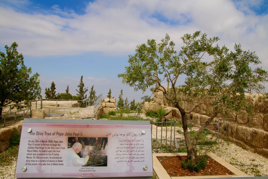 Giunti quasi al termine della visita si prosegue verso la nostra sinistra e lì un ulivo, con accanto l’immagine di Papa Wojityla, cattura la nostra attenzione. Il Papa visitò questo luogo il 20 marzo del 2000 e al termine della visita piantò un ulivo per ricordare il suo passaggio sul Monte Nebo e per inviare un messaggio di pace alle popolazioni della regione.