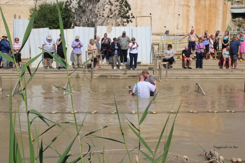 Sotto l’occhio vigile delle guardie di confine attraversando un pontile in legno si riesce a scendere sino al livello del fiume. Guardando verso la sponda israeliana notiamo numerosi fedeli che s’immergono nel fiume per rinnovare il sacramento del Battesimo.