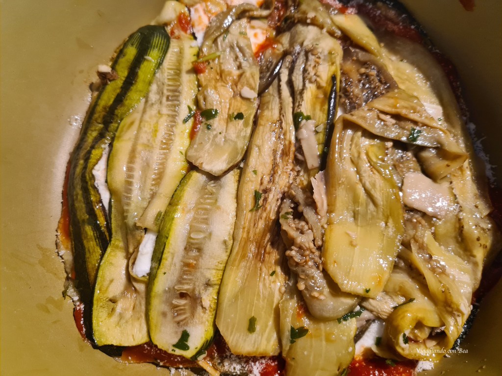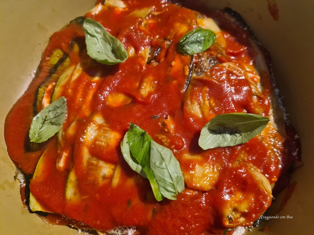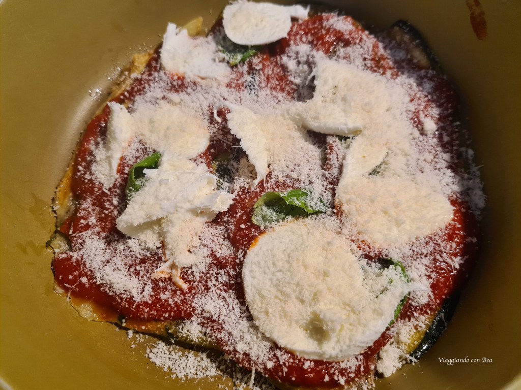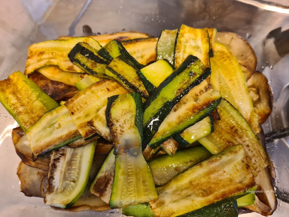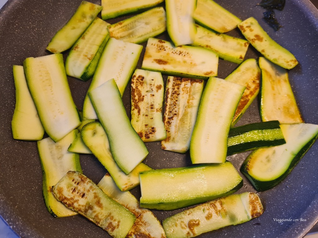 - Prendete una padella antiaderente un po’ più alta ed adagiate le verdure alternando le melanzane con le zucchine