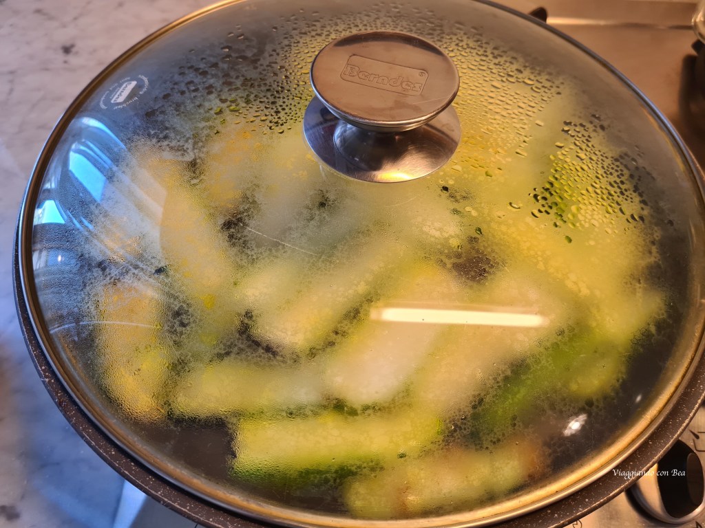 - Coprite con un coperchio e lasciate cuocere per qualche minuto. Seguite la cottura e giratele spesso. Con questo procedimento il sapore delle verdure è un po’ un mix tra fritto e grigliato. Decisamente più gustoso ma anche un po’ più calorico 😉