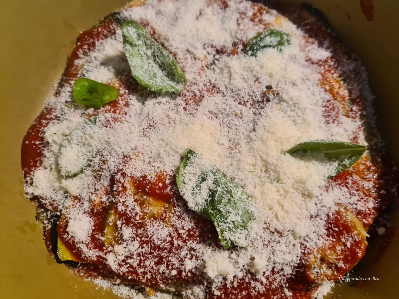 - Un po’ di di sale, aggiungete un po’ di salsa, spolverizzate con del parmigiano, qualche tocchetto di mozzarella, qualche foglia di basilico e… procedete con lo strato successivo