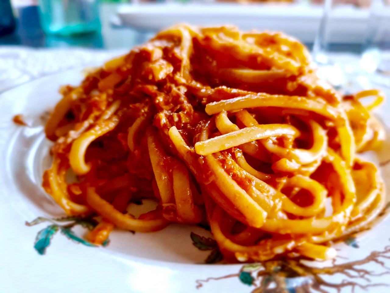 - Quando la pasta sarà quasi cotta aggiungete il sugo, alzate la fiamma e continuate ad amalgamare. Se il sugo dovesse essere troppo liquido toglietene un po’ altrimenti continuate ad amalgamare fino a dare al vostro piatto una cremosità irresistibile. Attenzione alla cottura.