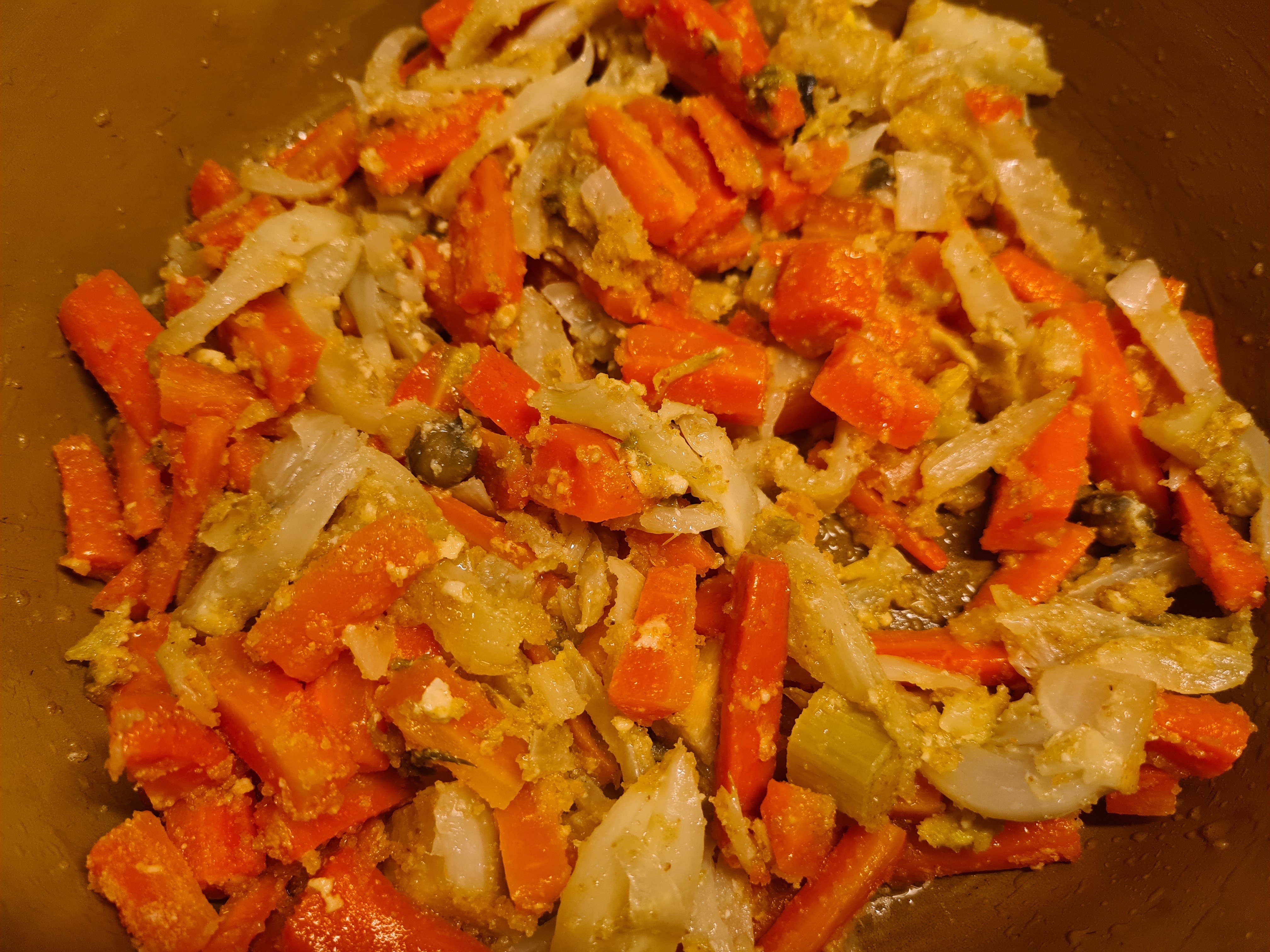 Come dicevo prima, nel frigo non c’è quasi nulla. Non trovo altro che dei finocchi, delle carote ed in dispensa qualche cappero sottosale. Non mi scoraggio ed incomincio a lavare ed affettare sottilmente la parte più tenera di 3 finocchi e di 3 carote. Metto il tutto in una padella antiaderente con l’aggiunta di una manciata di capperi, aggiungo una buona quantità d’olio e procedo per una cottura lenta.