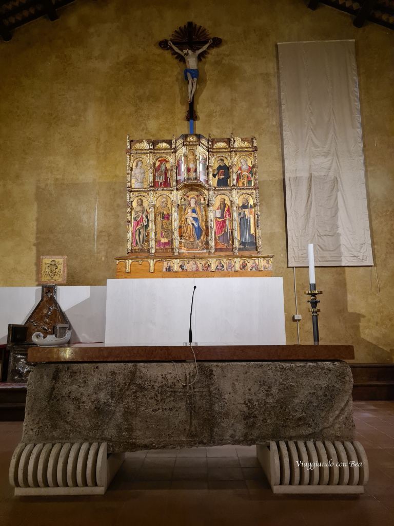 Entrando lo si nota subito non solo per la sua raffinatezza ma, soprattutto, per i suoi magnifici colori smaltati esaltati dall’oro dello sfondo. E’ composto da 12 scomparti ed al centro spicca l’immagine della Vergine che ha sulle ginocchia il Gesù Bambino. Leggo su internet che “il polittico è alto 2,37 metri e largo 2,50 e fu commissionato a Crivelli, alla fine del ‘400, dal Priore degli Agostiniani per la chiesa di Sant’Agostino”. Le opere d’arte sacra avevano un ruolo molto importante nella vita religiosa dell’epoca ed i polittici venivano commissionati per adornare luoghi di culto.