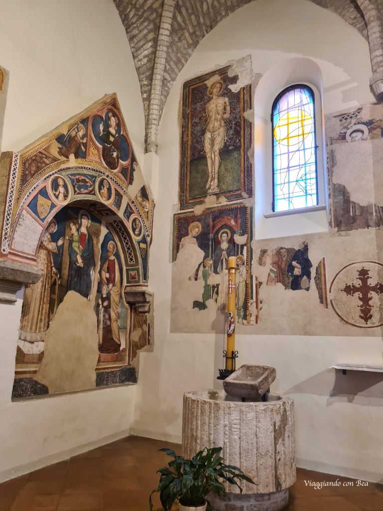 Il suo interno, rimaneggiato nel ‘900, è caratterizzato da un’ampia navata centrale e da due navate laterali. Ha volte a crociera che il pittore Sigismondo Nardi ha affrescato con l’immagine della Vergine, delle Virtù Teologali e Cardinali.  Nelle pareti della navata di sinistra possiamo notare degli affreschi che risalgono al ‘300 ed in particolare ce n’è uno raffigurante il volto di Sant’Andrea che è attribuito alla scuola dei Salimbeni.